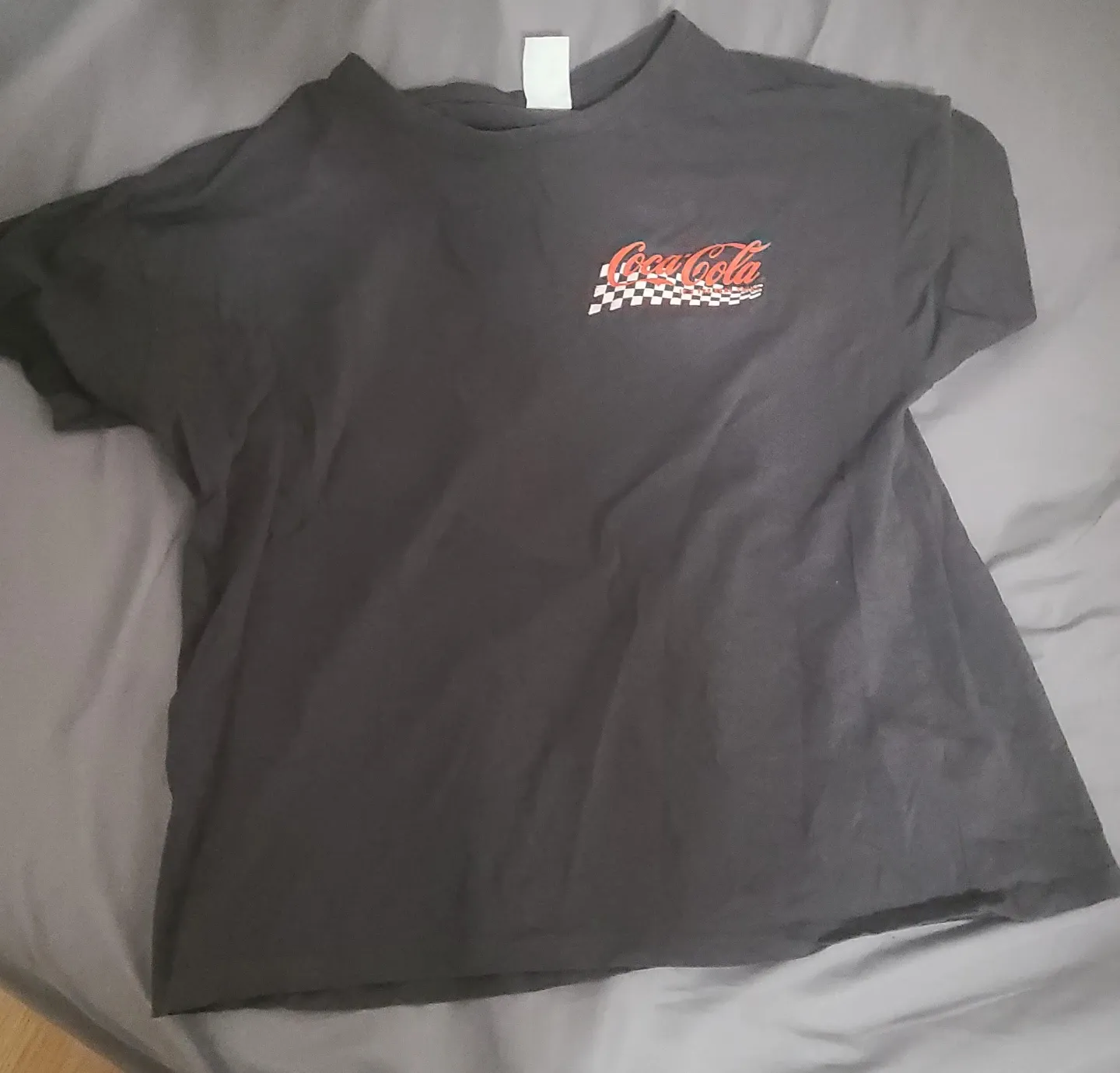 Here's a cool grey Coca-Cola graphic tee! The logo is a fun, retro design with a checkered pattern. It's in great condition and ready for a new home!