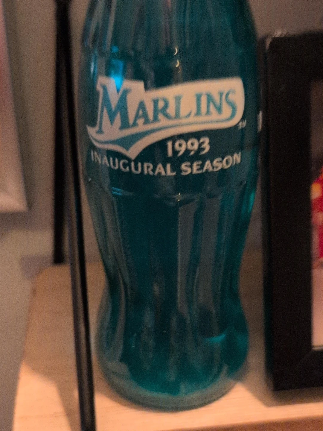 This is a teal coloured commemorative bottle. It celebrates the Marlins' 1993 inaugural season. It's a unique piece for collectors or fans!