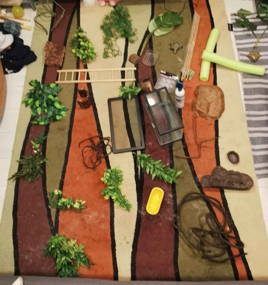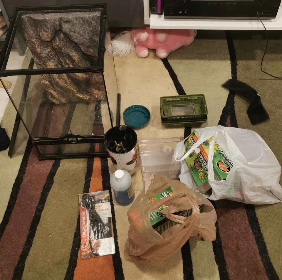 Feeder Management: 3x Cricket Containers with vented lids and "Easy-Catch" tubes. 1x Cricket Dusting Container (very tall cup small/medium crickets cannot jump out of) (for calcium/vitamin coating). Professional Tools: Two pairs Feeding Tweezers. Sanitation & Setup: Fluker’s Super Scrub with integrated brush. 1x 12x8x6 Utility/Feeding Glass Tank with mesh lid (perfect for supervised feeding or quarantine). Climbing/Misc: 2x Pool Noodles and a bundle of Bamboo Sticks.