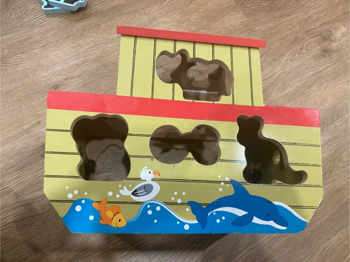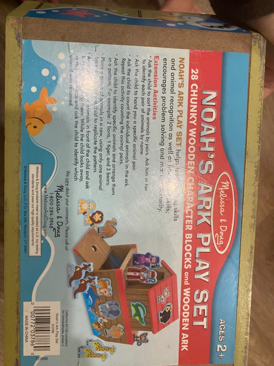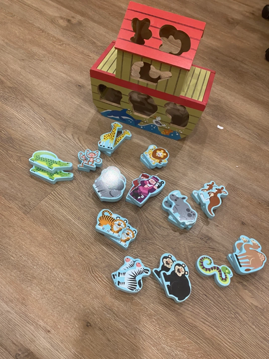 Melissa and Doug Noah's Ark chunky wooden play set. This set includes the wooden ark and various chunky animal figures. Most of the animals are paired a up. A few of them are missing the pairing (the snake, the lion and the cheetah. My kids used the lion and the cheetah as a pair). It's designed for ages 2 and up to help with recognition and problem-solving skills. We used it as a puzzle, a matching game, a stacking game, sorting activity and for patterning! It is such a versatile toy.