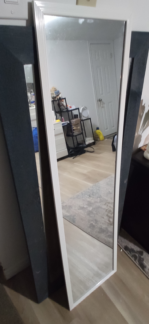 Selling a full-length long mirror with a white frame. It's in great condition and ready to brighten up any room!