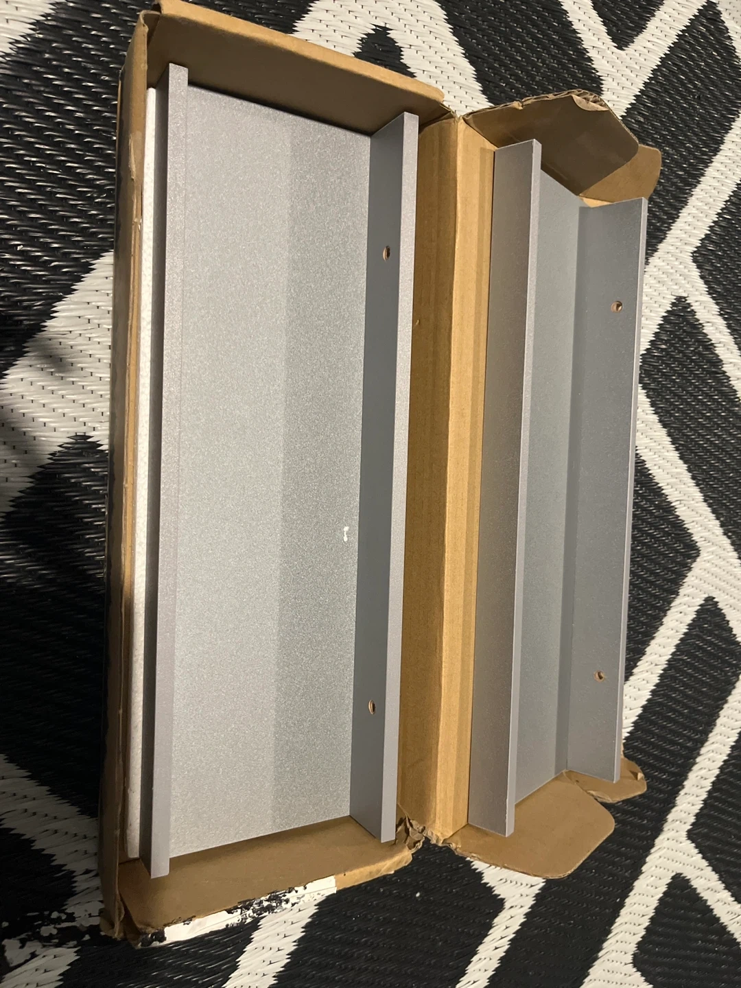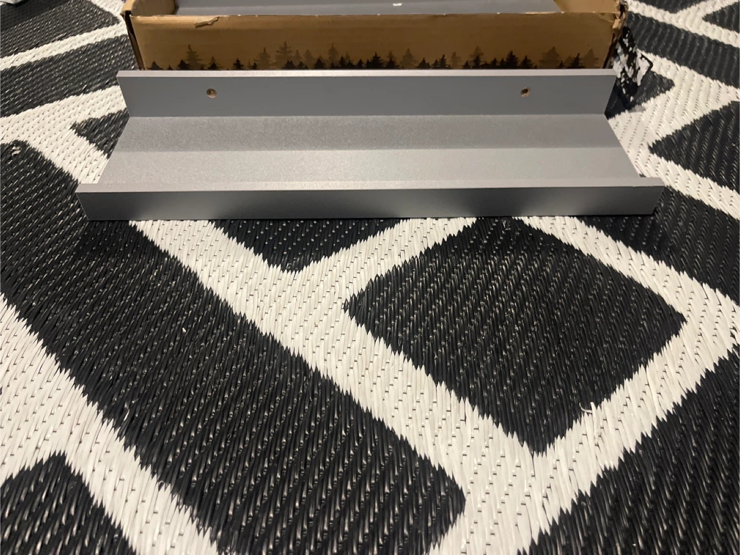 It's a grey metal floating shelf. The shelf is 24 inches long and made of wood . It includes mounting hardware. This shelf is suitable for displaying small items.