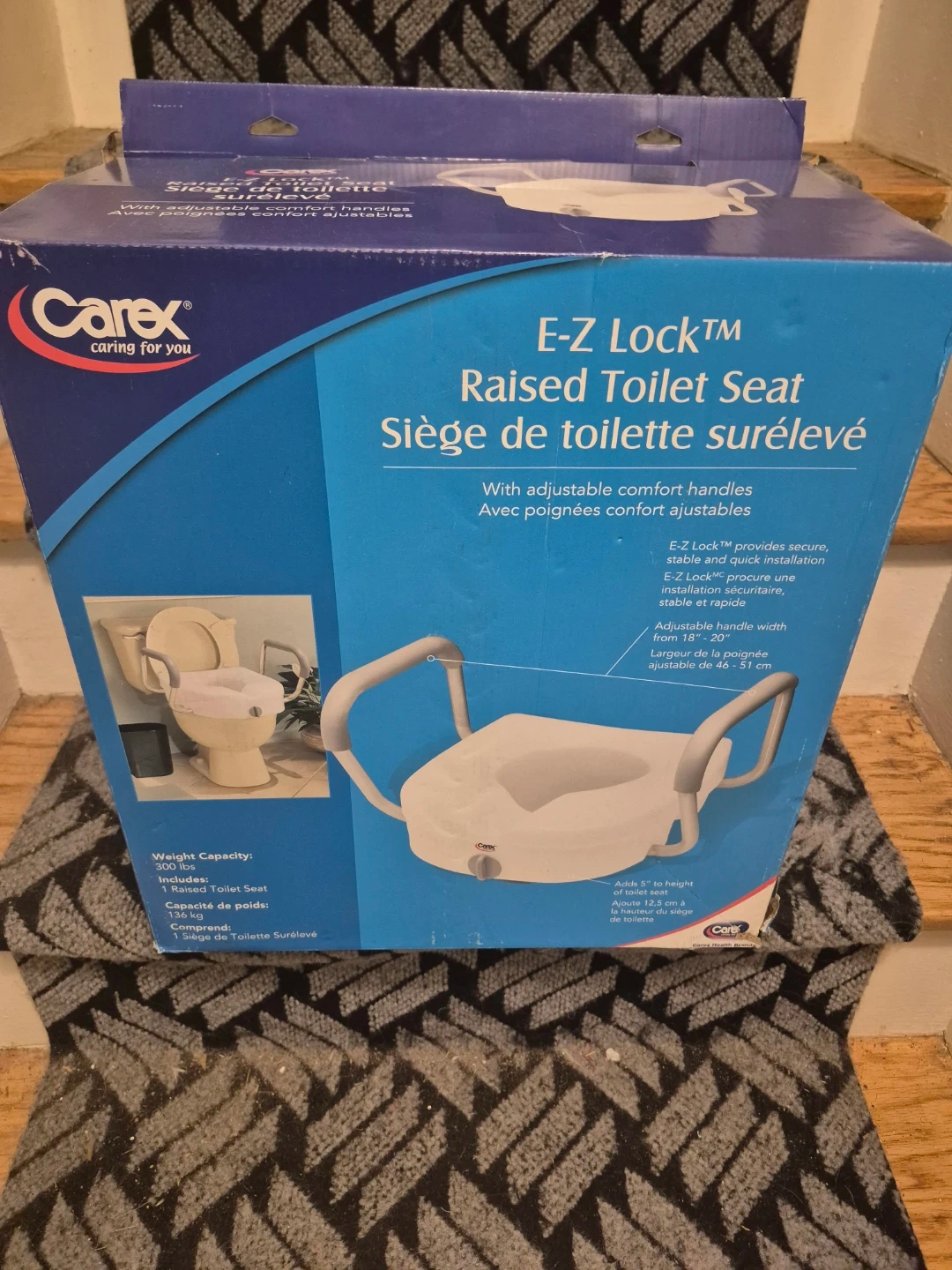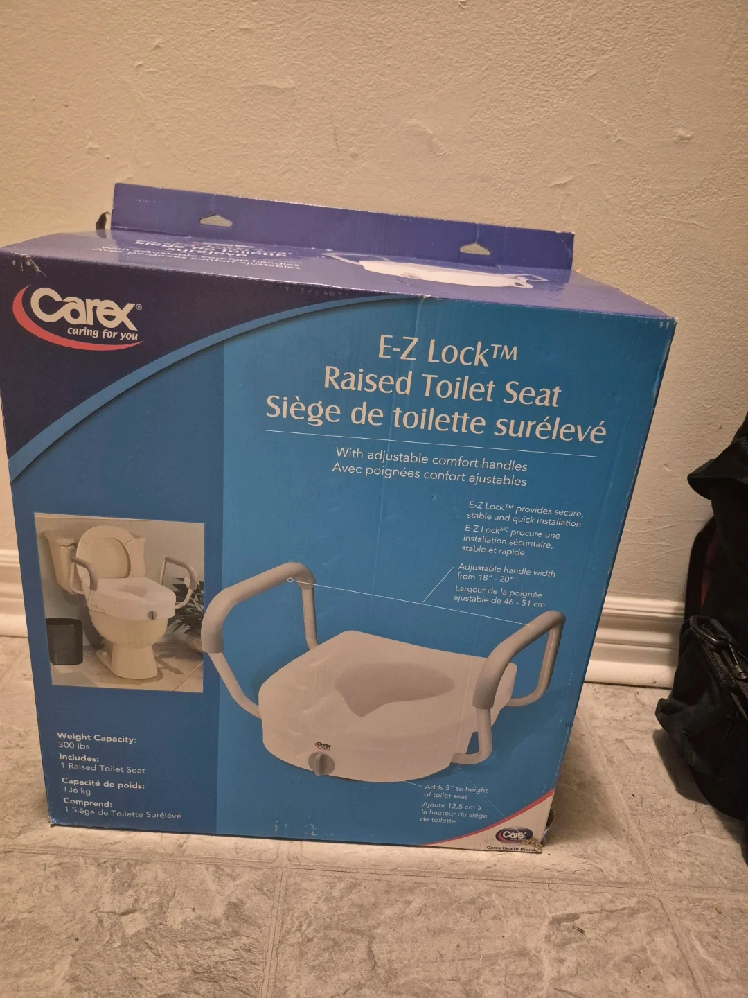 Selling a new in the box never used. Carex E-Z Lock raised toilet seat! It comes with adjustable comfort handles for easy use. The E-Z Lock system provides secure, stable, and quick installation. The handle width is adjustable from 18 to 20 inches (46-51 cm). It adds 5" to the height of the toilet seat. Also, the original box is included!