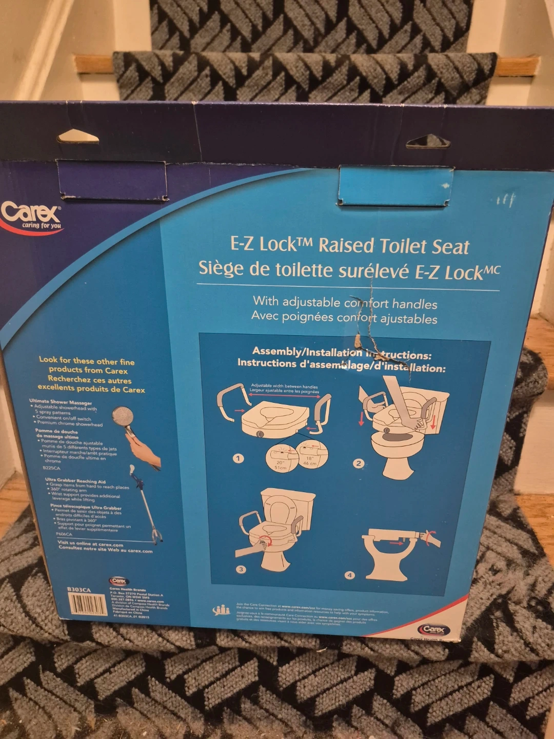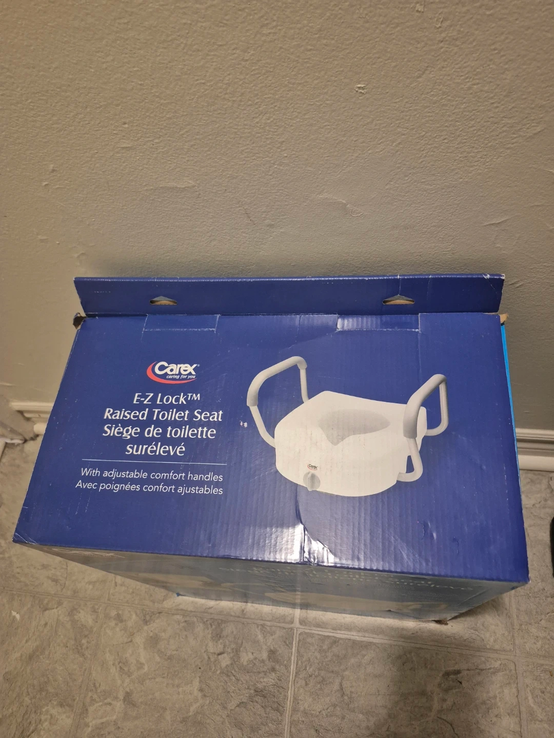 Selling a new in the box never used. Carex E-Z Lock raised toilet seat! It comes with adjustable comfort handles for easy use. The E-Z Lock system provides secure, stable, and quick installation. The handle width is adjustable from 18 to 20 inches (46-51 cm). It adds 5" to the height of the toilet seat. Also, the original box is included!