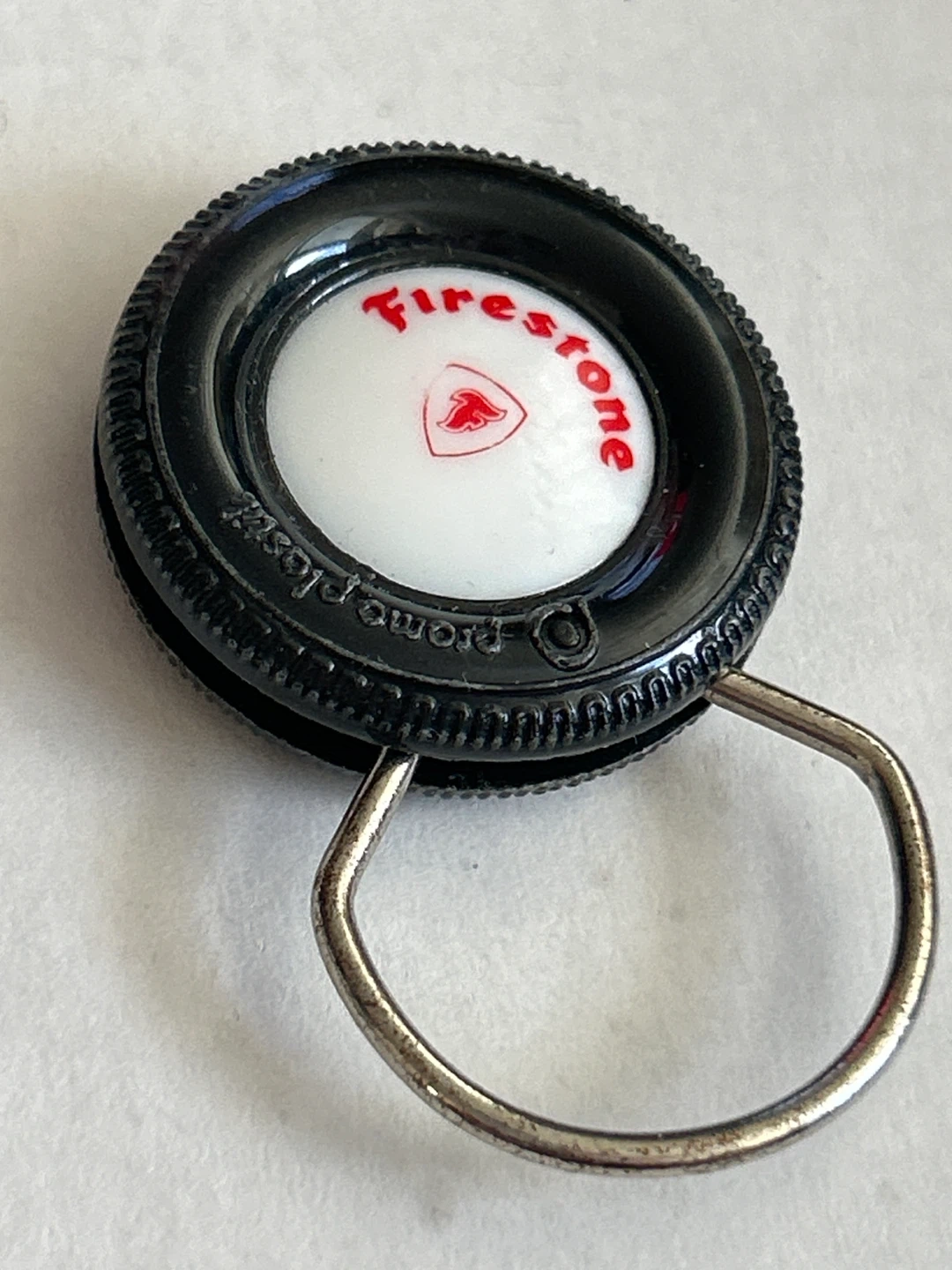 Vintage Firestone tire-shaped keychain. This novelty item is made of black plastic with a metal keyring. It's a fun accessory for car enthusiasts or collectors.