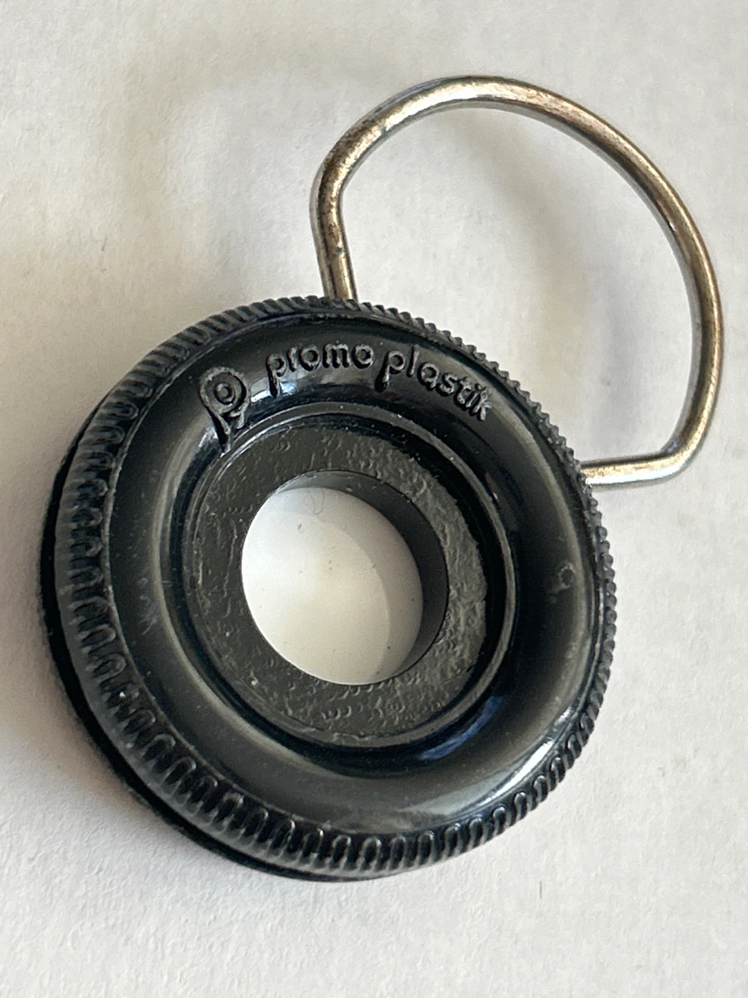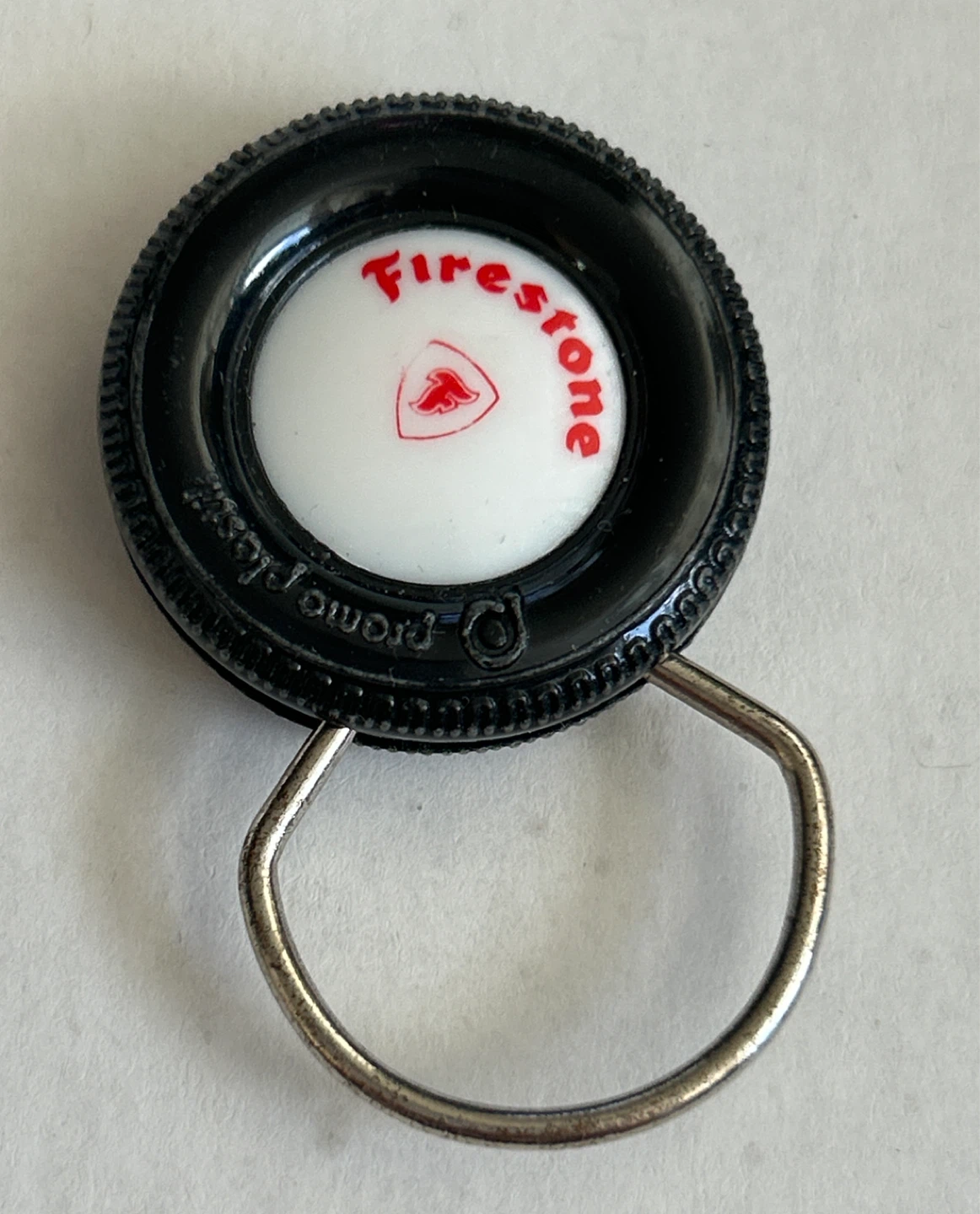 Vintage Firestone tire-shaped keychain. This novelty item is made of black plastic with a metal keyring. It's a fun accessory for car enthusiasts or collectors.