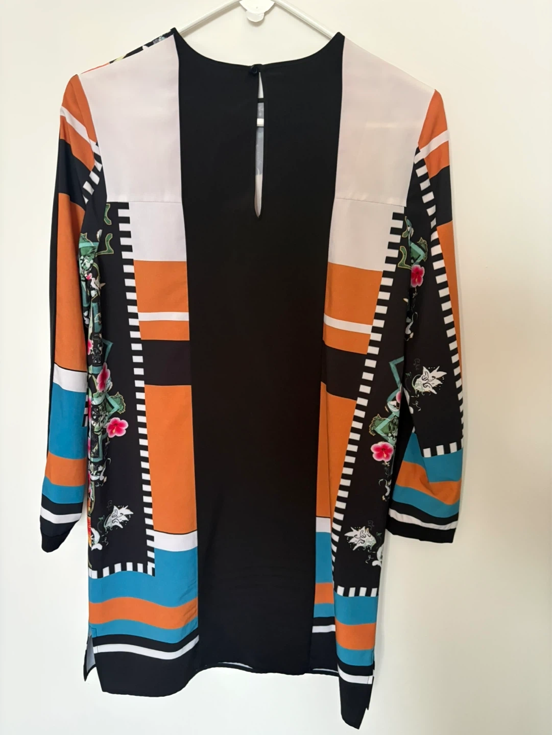 Elegant black mini dress with vibrant floral patterns. Long sleeves, classic shift silhouette. Really cool print which is the brand’s signature style. Perfect condition.