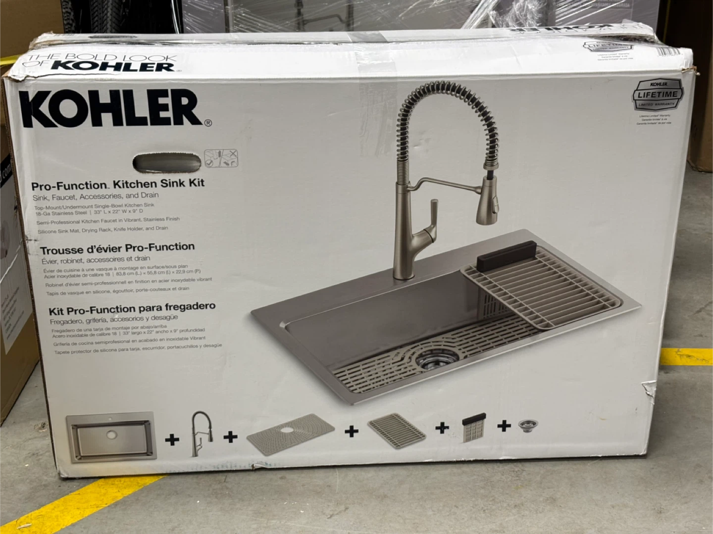 This is a new Kohler Pro-Function Kitchen Sink Kit. It's a top-mount undermount single bowl kitchen sink. The sink is made from 18-Gauge stainless steel.