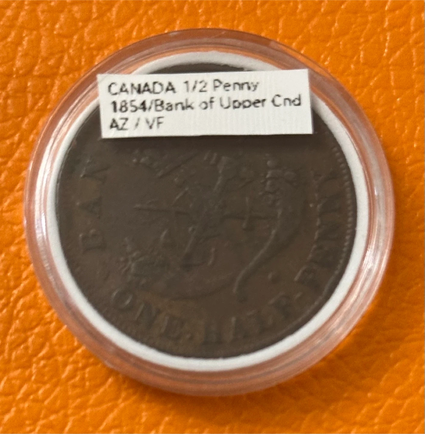 This is a rare 1854 Canadian 1/2 Penny coin from the Bank of Upper Canada. It's in VF condition. This coin would be a great addition for any coin collector.