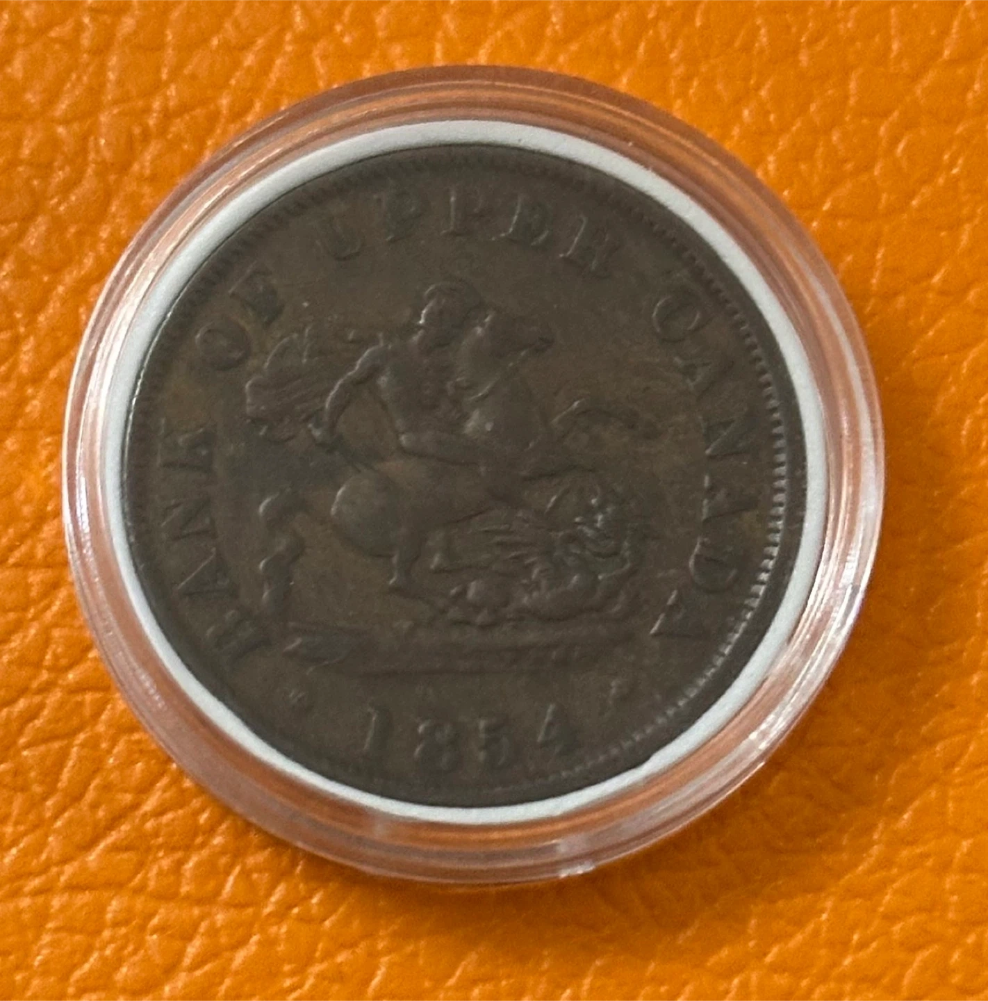 The 1854 Bank of Upper Canada Half Penny copper token. This coin is often referred to as the "Dragon Slayer" token because it features St. George slaying the dragon based on a design by Benedetto Pistrucci.