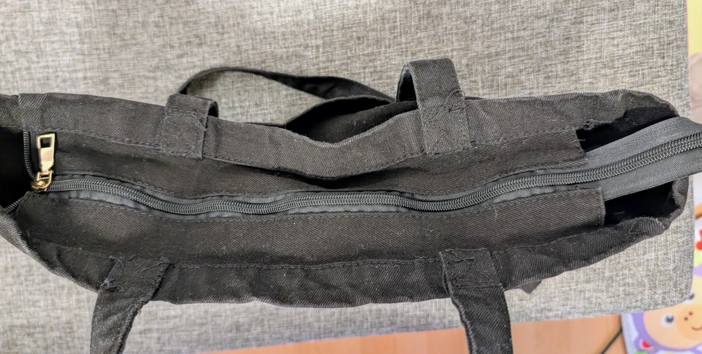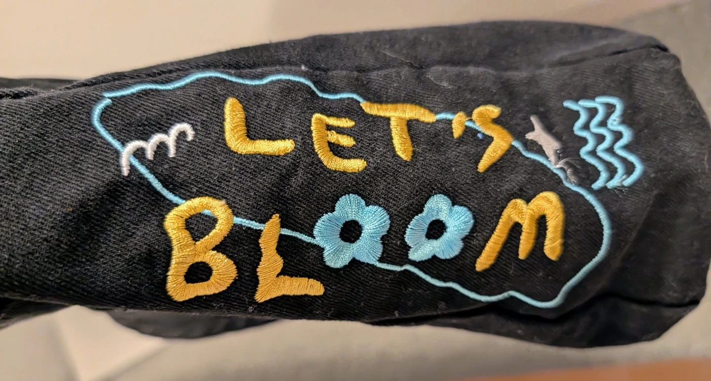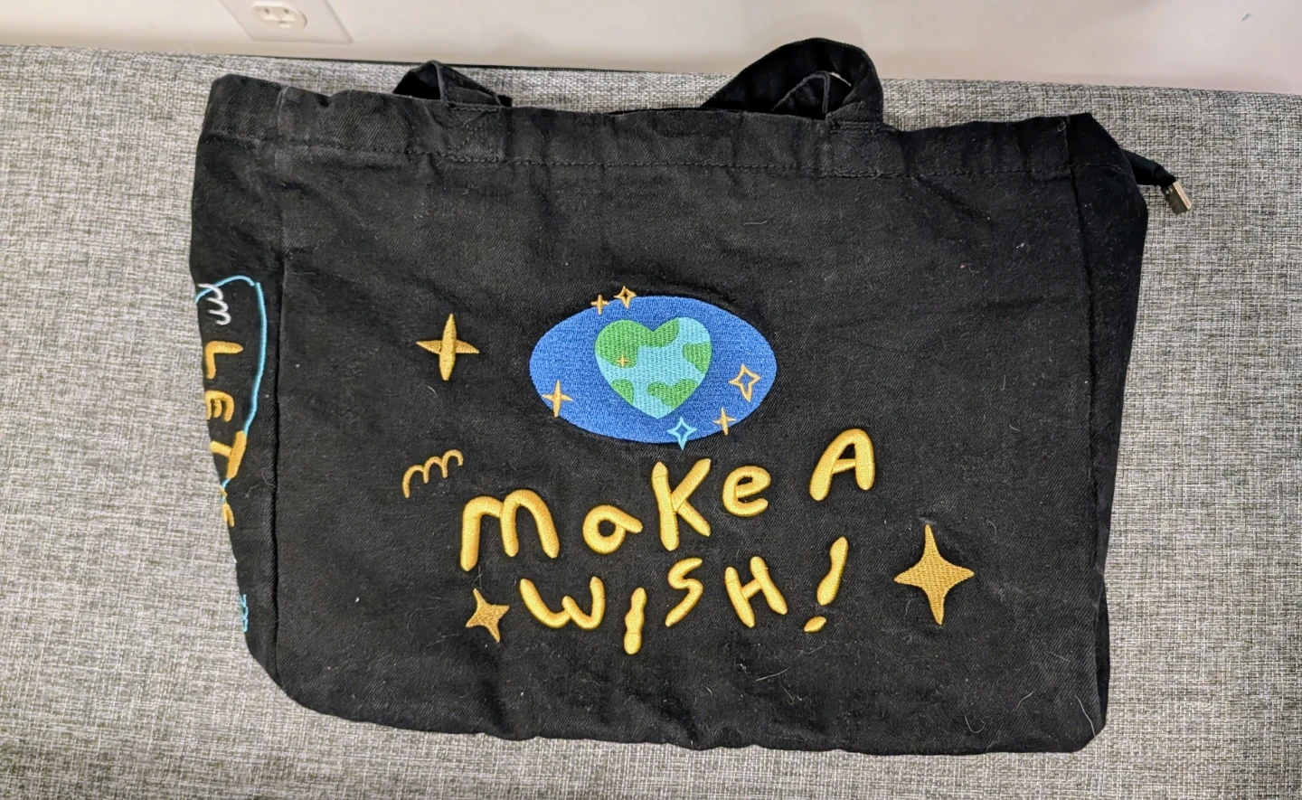 This black canvas tote bag features fun embroidered designs including a teddy bear holding the Earth and the phrases "Make A Wish!" and "Let's Bloom!". It's a zippered tote, perfect for everyday use or as a unique accessory. The bag is made of durable canvas material.