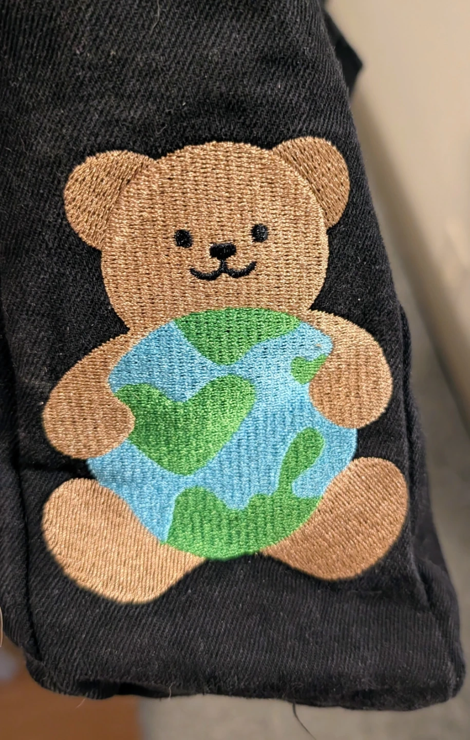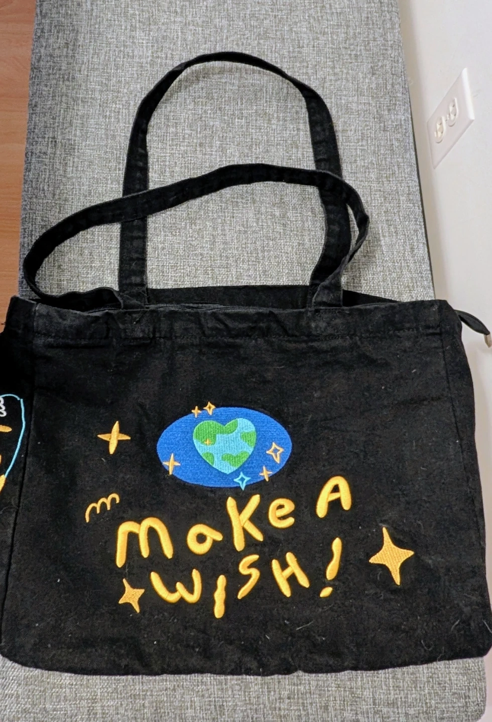 This black canvas tote bag features fun embroidered designs including a teddy bear holding the Earth and the phrases "Make A Wish!" and "Let's Bloom!". It's a zippered tote, perfect for everyday use or as a unique accessory. The bag is made of durable canvas material.