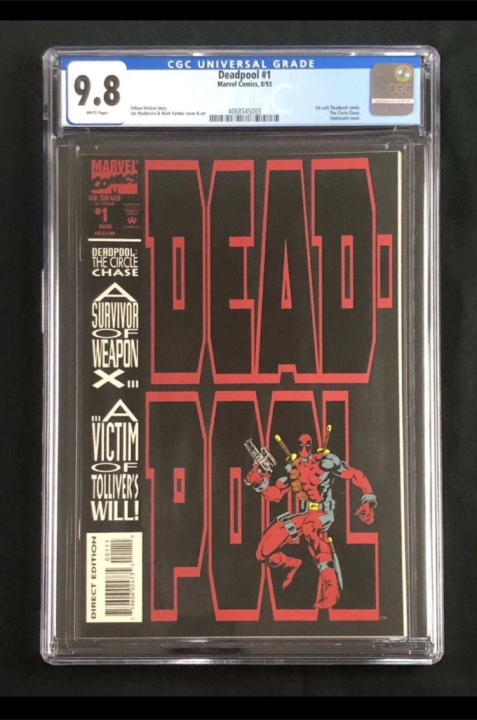 Deadpool #1 comic from Marvel Comics, published in August 1993. Graded CGC 9.8 Universal Grade. This copy features the 'The Circle Chase' storyline. It's presented in a protective CGC case.