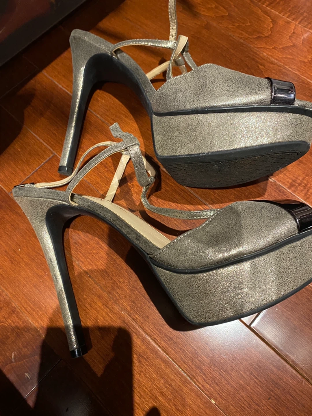Sparkly silver heeled sandals by Jessica Simpson. Features a strappy design with a peep toe and platform. Perfect for dressing up an outfit!