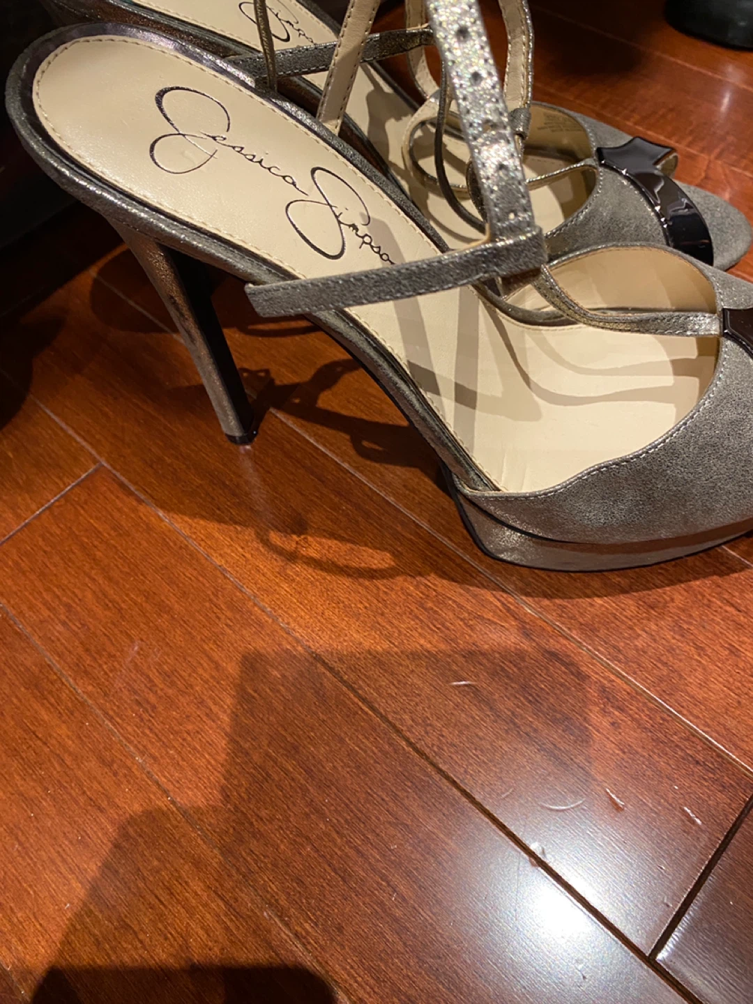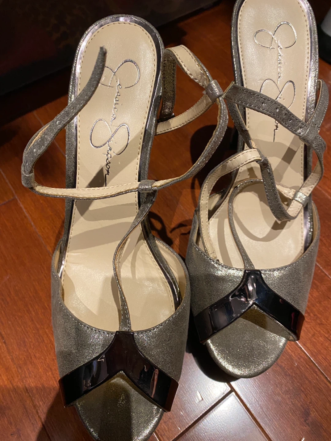 Sparkly silver heeled sandals by Jessica Simpson. Features a strappy design with a peep toe and platform. Perfect for dressing up an outfit!