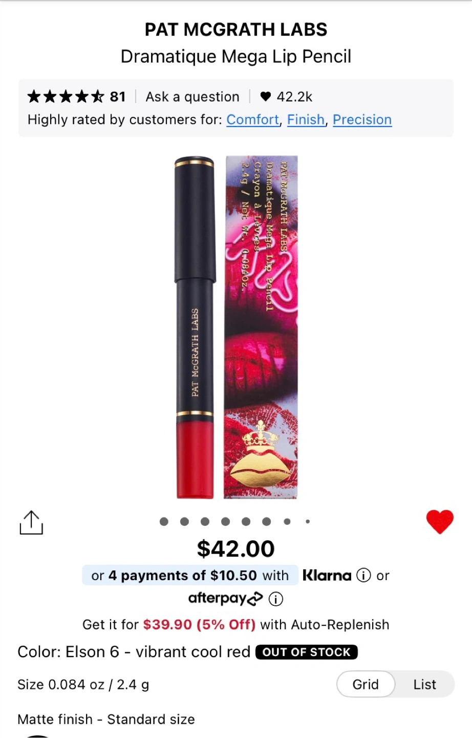 This is the Pat McGrath Labs Dramatique Mega Lip Pencil in shade Elson 6, a vibrant cool red. It has a matte finish and is a standard size. The net weight is 0.084 oz / 2.4 g.