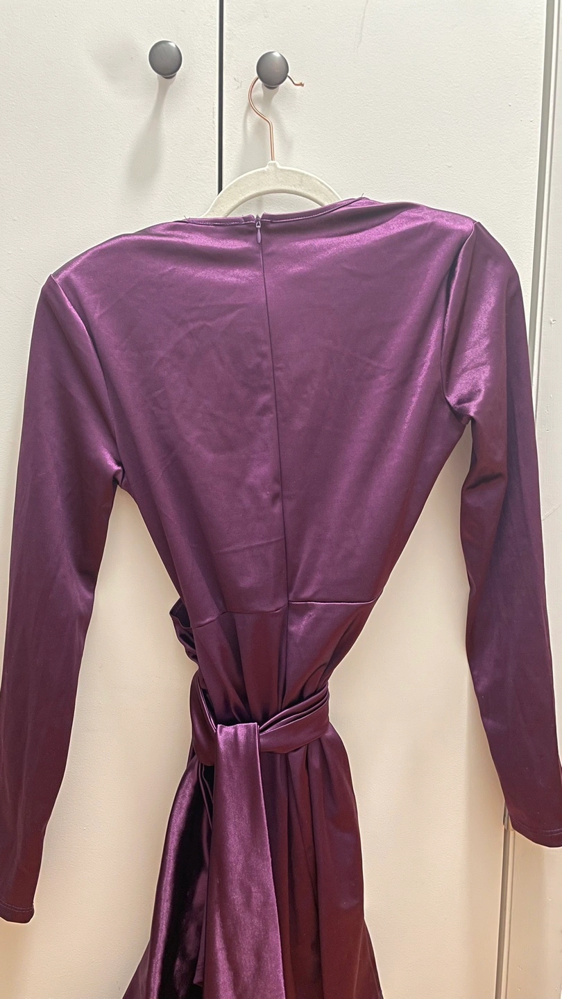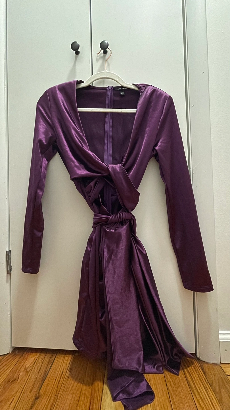 Gorgeous shimmery purple mini dress. Long sleeves with shoulder pads. Wrap style with a tie waist. Slightly shimmery satin material. Back zipper closure. Fits curves beautifully.