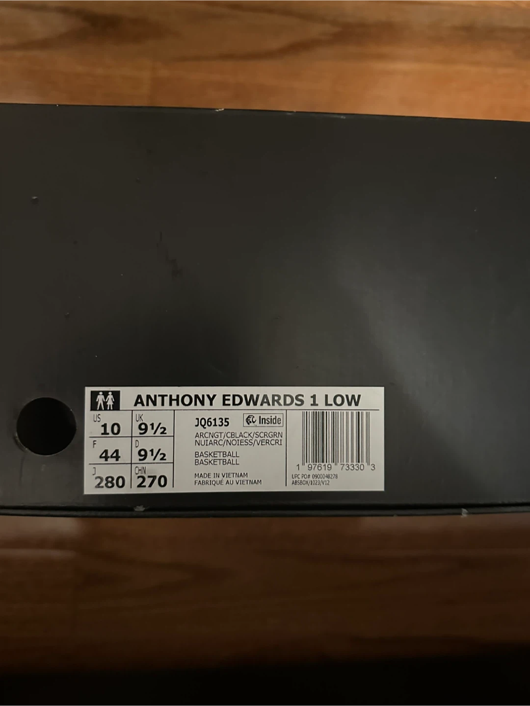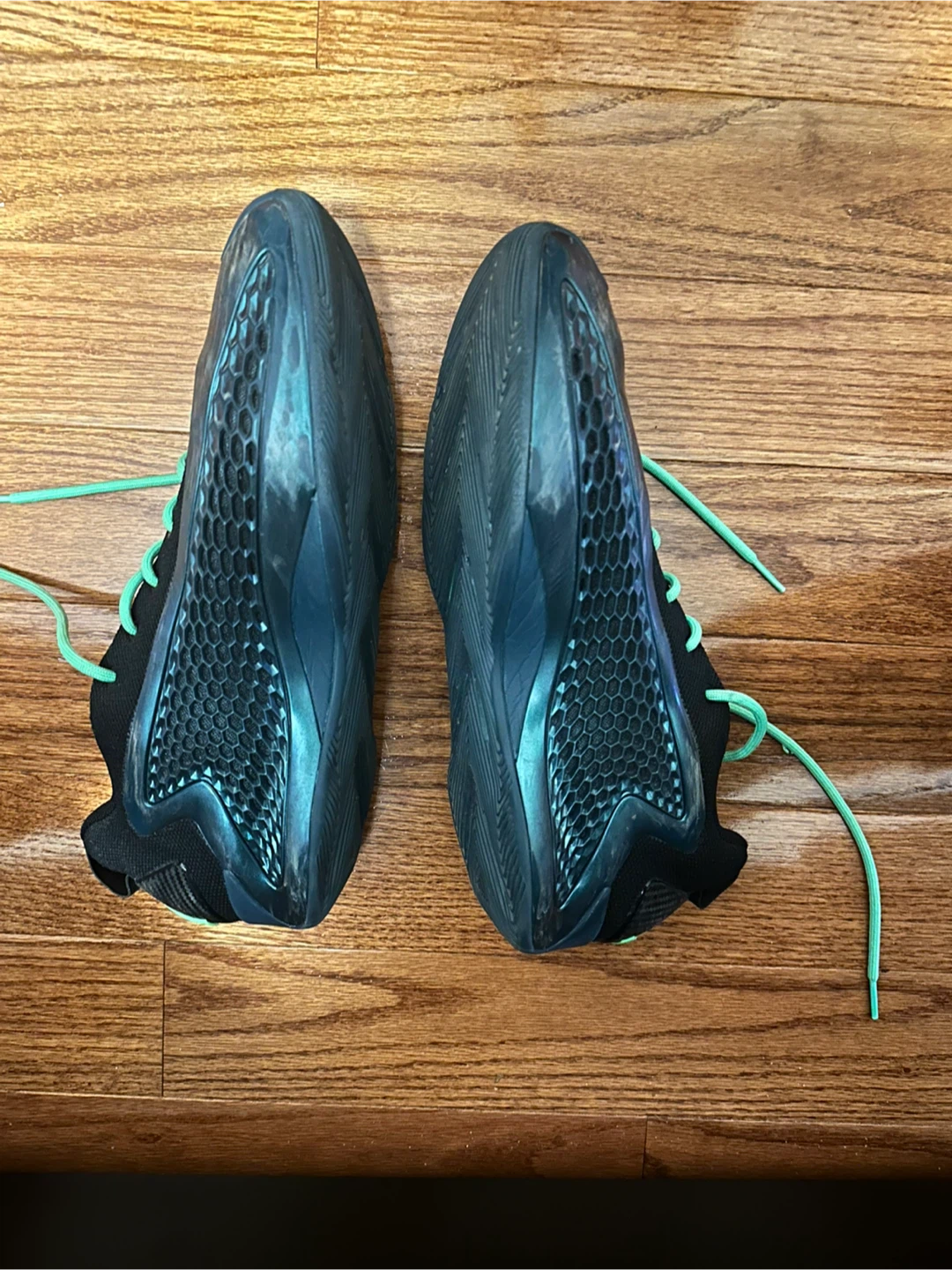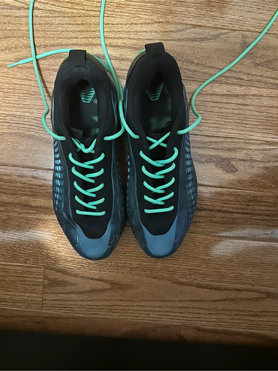 These are Anthony Edwards basketball shoes with a black and green colour way. They come with mint green laces and include the original box.