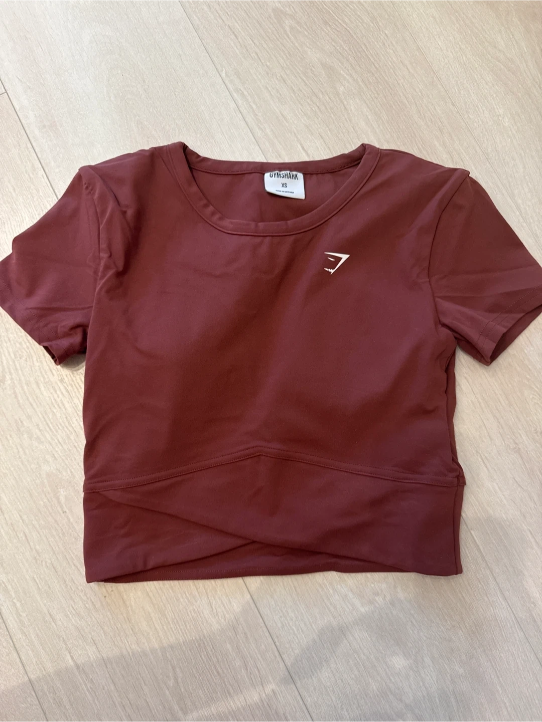 Totally New Gymshark short-sleeve cropped t-shirt in a maroon colour. It's size XS with a branded logo. This top is made of soft, breathable fabric.
