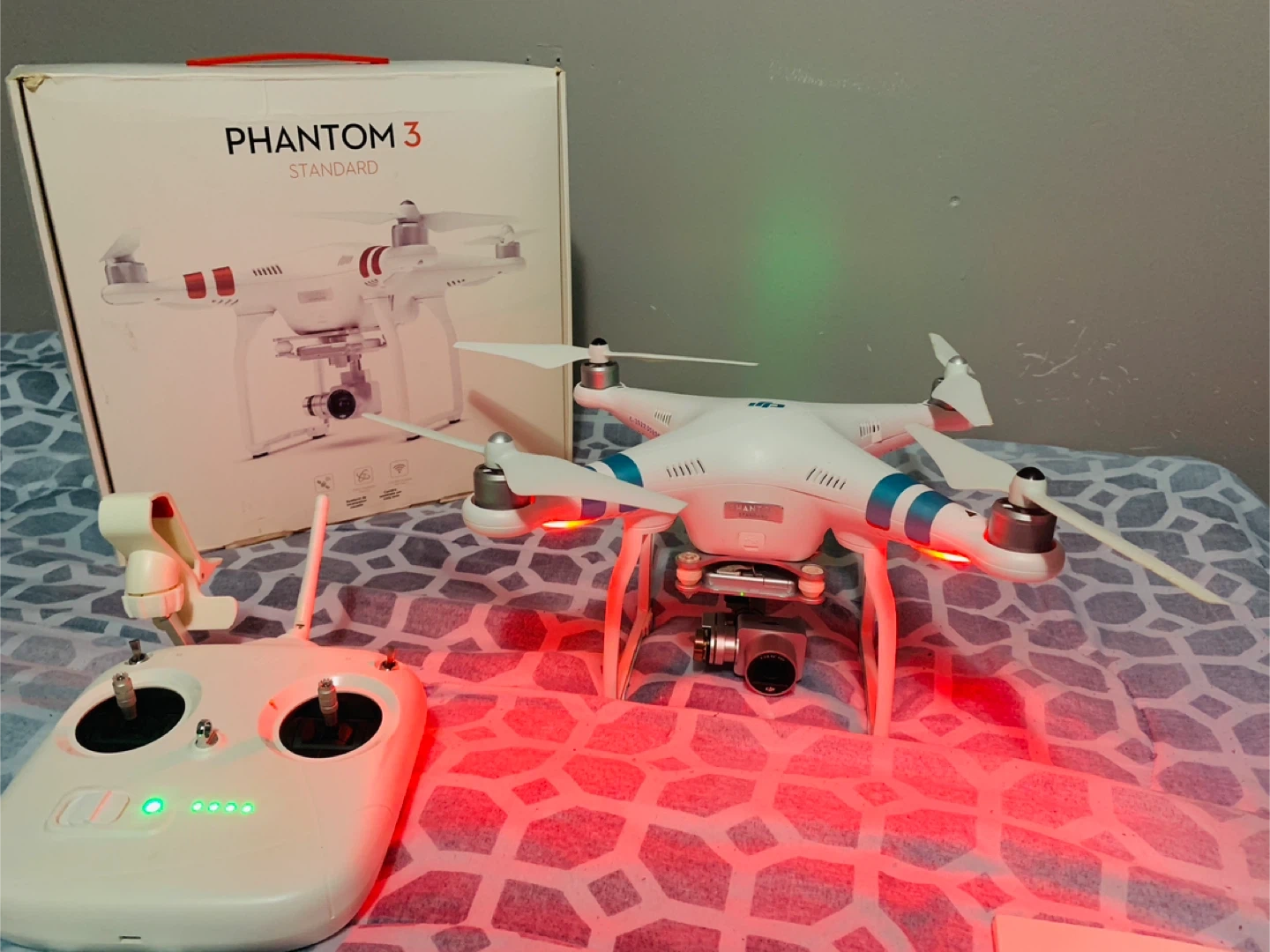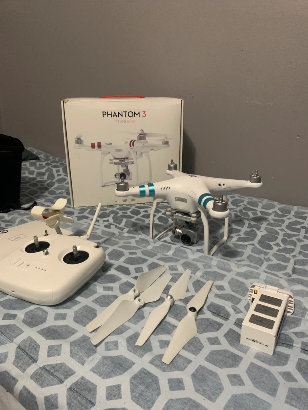 This is a DJI Phantom 3 Standard drone. It comes with a controller, extra propellers, and a battery. The original box is also included.