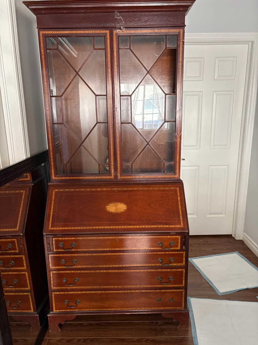 A beautiful antique secretary desk featuring a hutch with glass doors. It has a pull-down desk surface and multiple drawers for storage. The wood has intricate inlays and a rich finish.