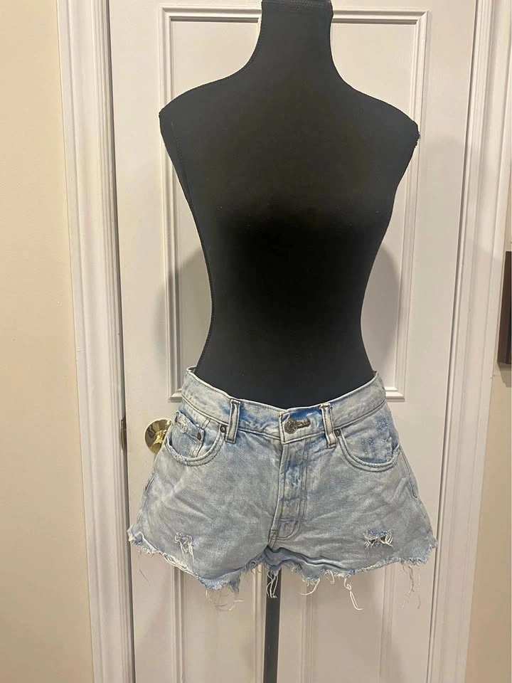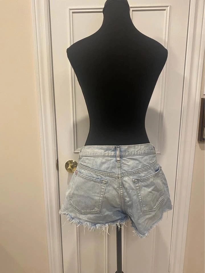Mid-rise light wash denim shorts with a raw hem and subtle distressing from Urban Outfitters. Size: W29. Pick up: Mississauga near Mavis & Rathburn OR Toronto near Queen St E & Parliament.
