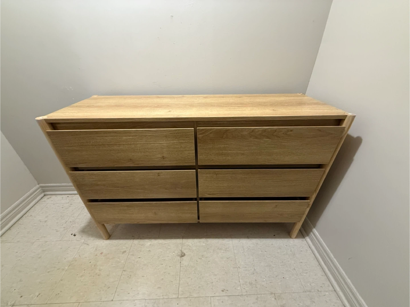 Six-drawer dresser with an oak finish. It has tapered legs and drawer fronts. Ample storage space for clothing or other items. Fits well in bedrooms or living spaces.