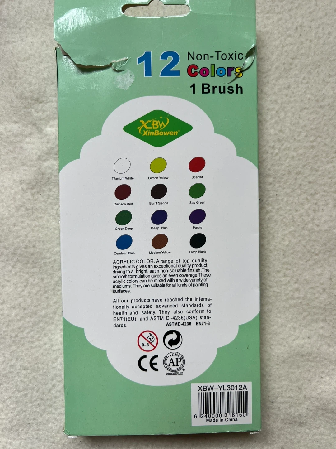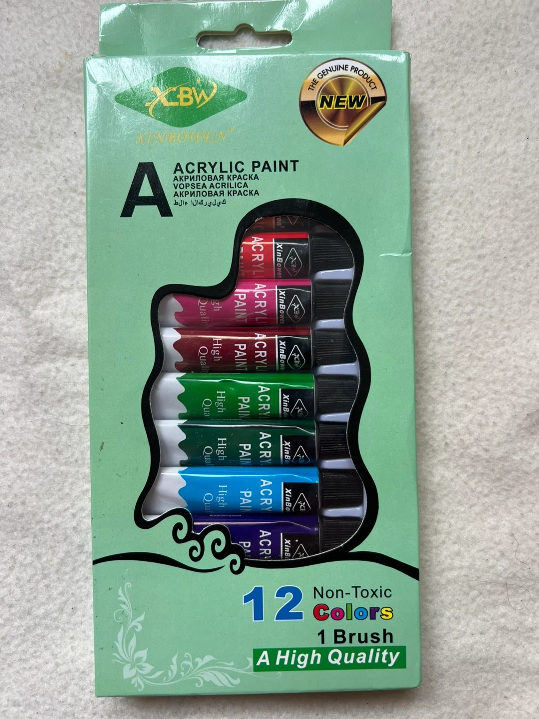This Xinbowen set includes 12 tubes of non-toxic acrylic paint in various colours. It also comes with one brush. The acrylic colour is made from high-quality ingredients and offers exceptional paint coverage. Its smooth formulation ensures even coverage on all painting mediums. Never been used still sealed.
