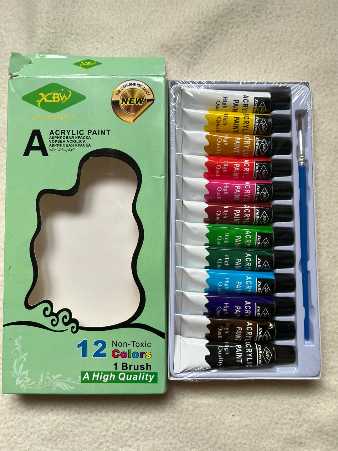 This Xinbowen set includes 12 tubes of non-toxic acrylic paint in various colours. It also comes with one brush. The acrylic colour is made from high-quality ingredients and offers exceptional paint coverage. Its smooth formulation ensures even coverage on all painting mediums. Never been used still sealed.