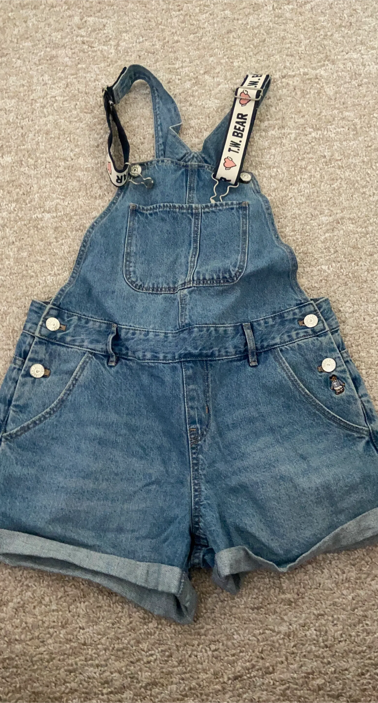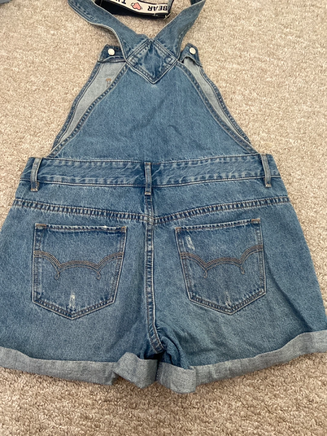 Cute denim short overalls with adjustable straps. Features classic five-pocket styling and button closures on the sides. Perfect for a casual summer look! Pickup only. Thanks!