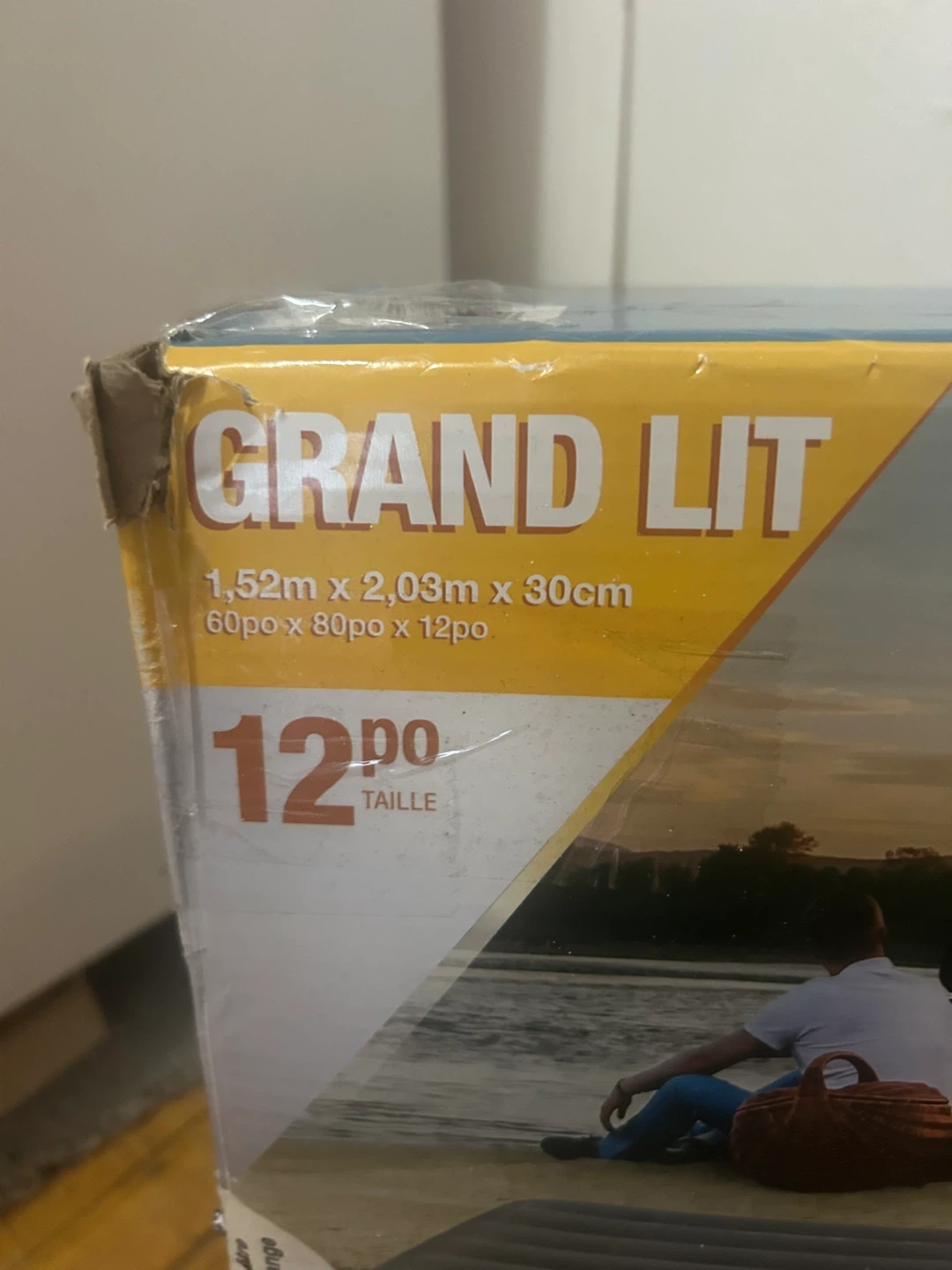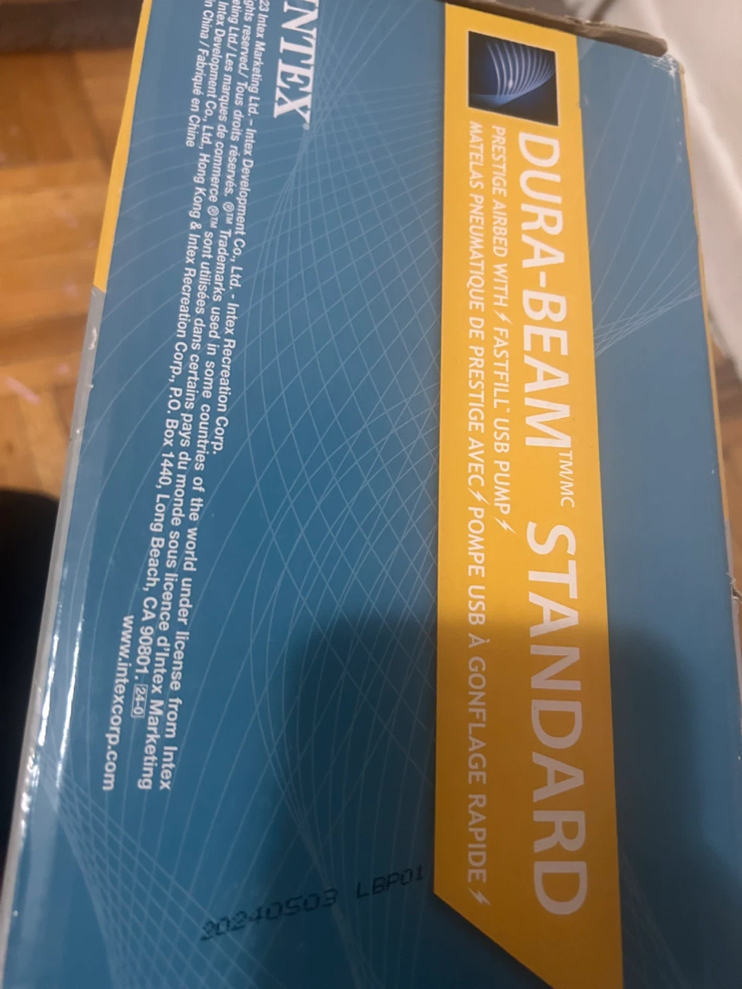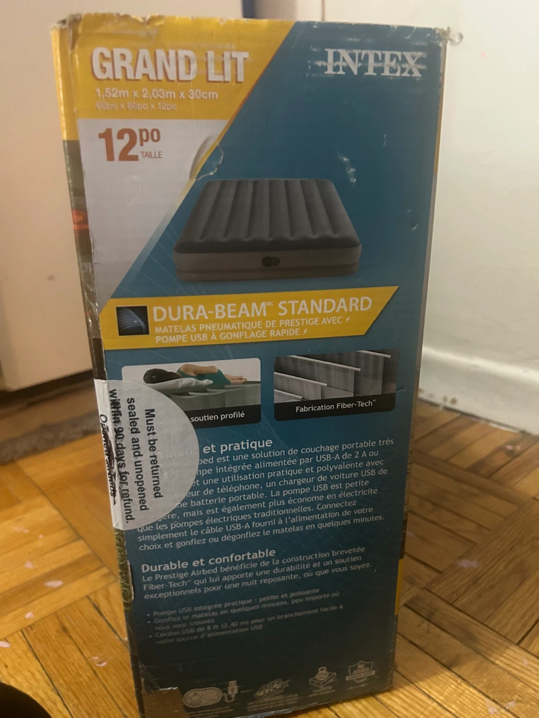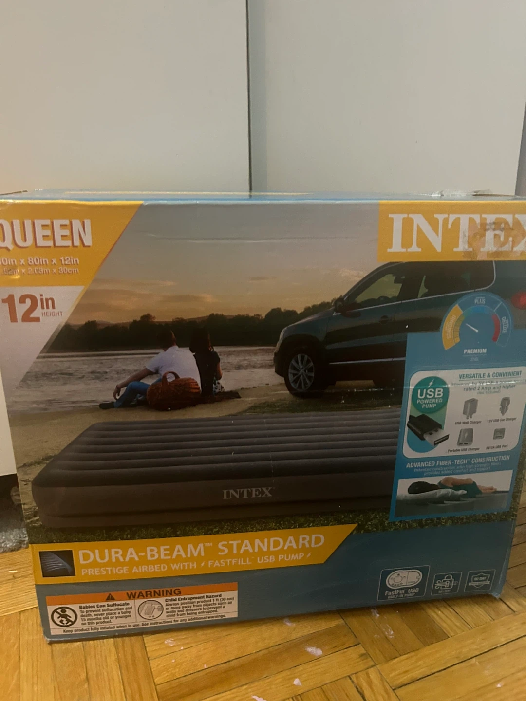 INTEX Dura-Beam Standard Queen air mattress with built-in USB pump. It measures 60in x 80in x 12in. Advanced Fiber-Tech construction provides durability and comfort.
