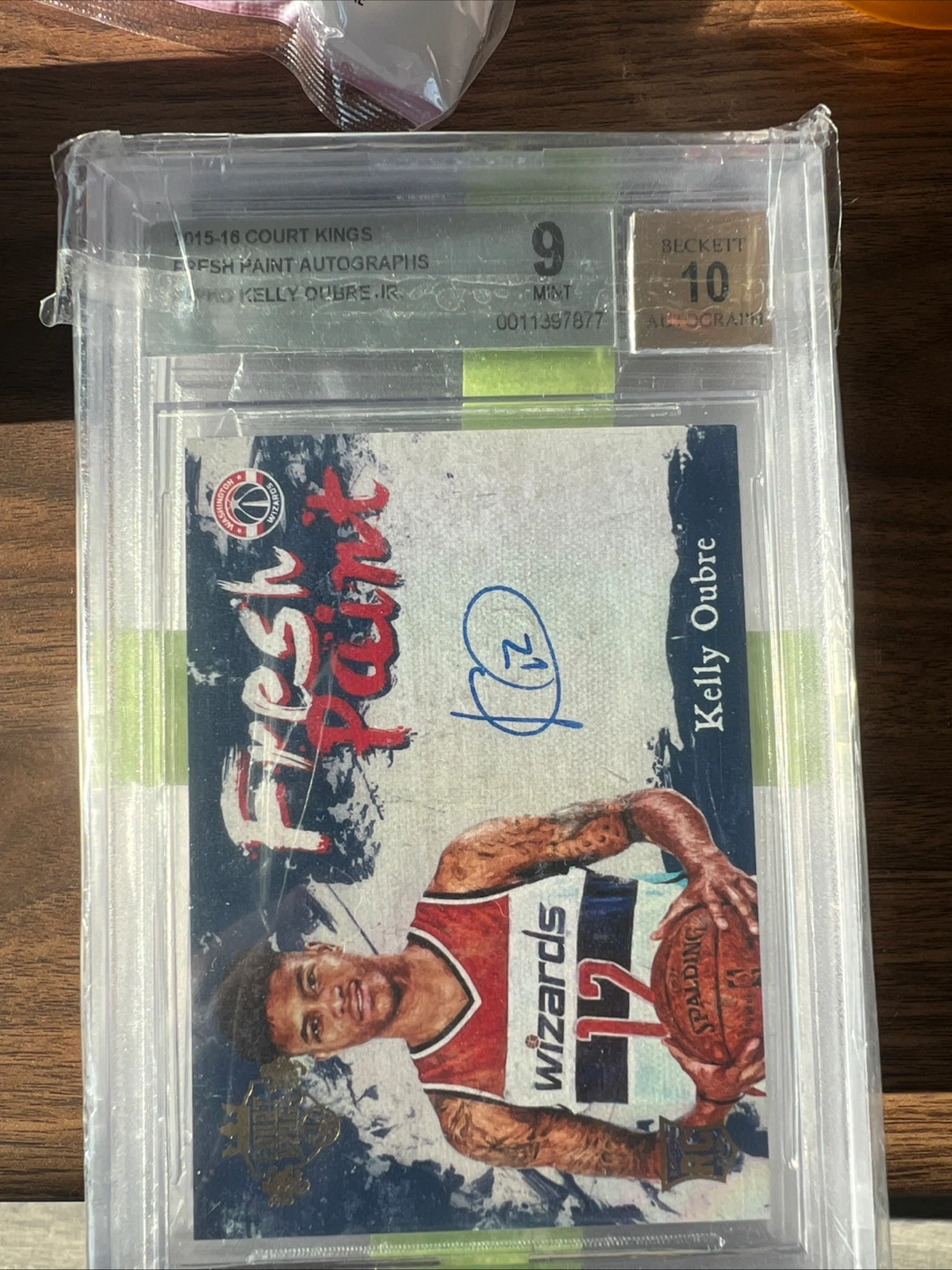 This is a 2015-16 Court Kings basketball card featuring Kelly Oubre Jr. of the Washington Wizards. It's an autographed "Fresh Paint" edition. The card is graded a 9 by Beckett Grading Services, with a perfect 10 for autograph! It's a great collectible for any basketball fan.