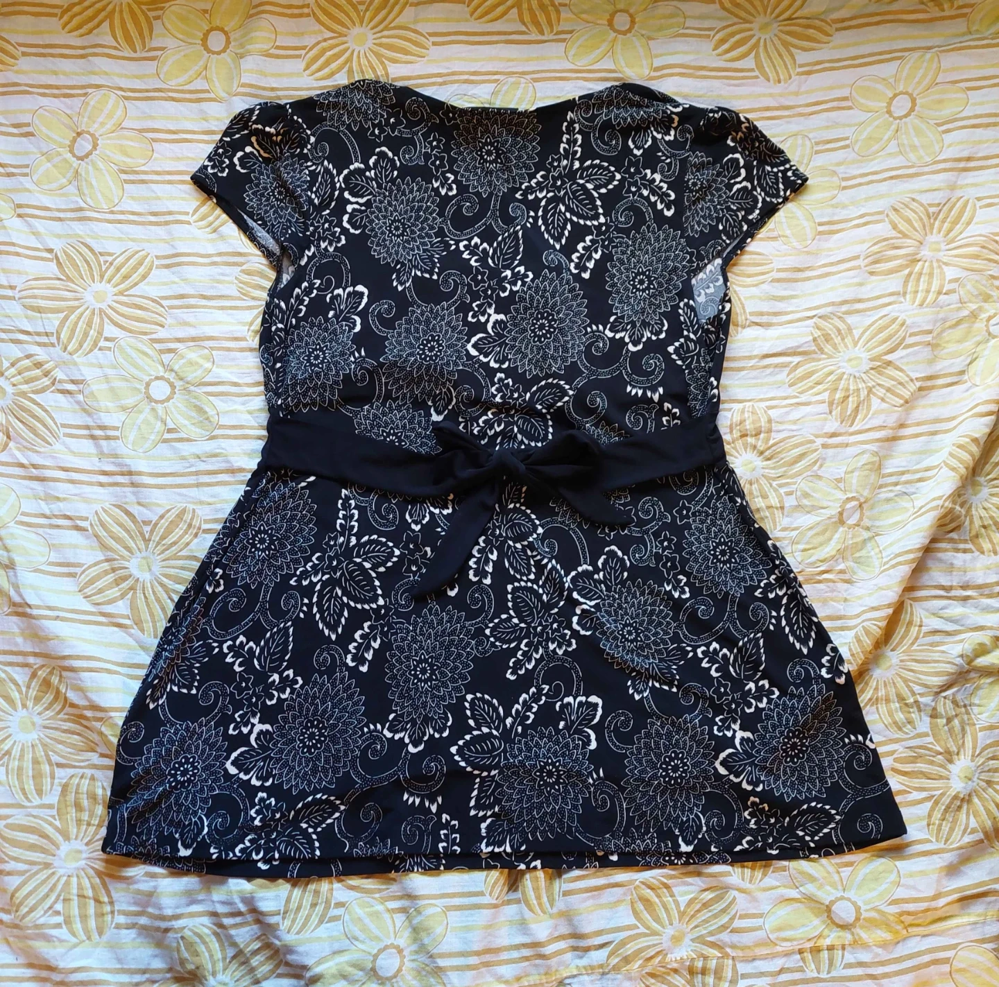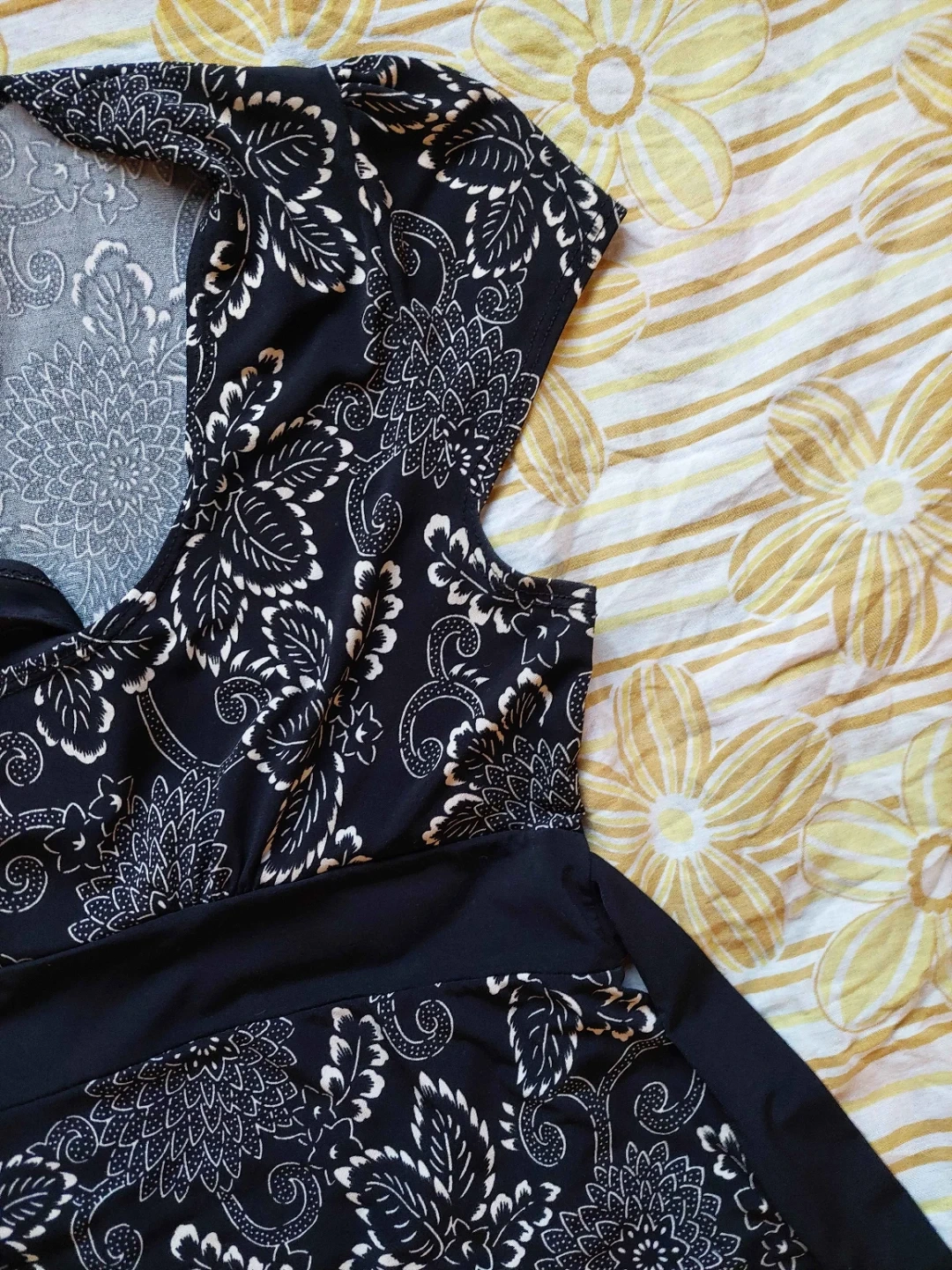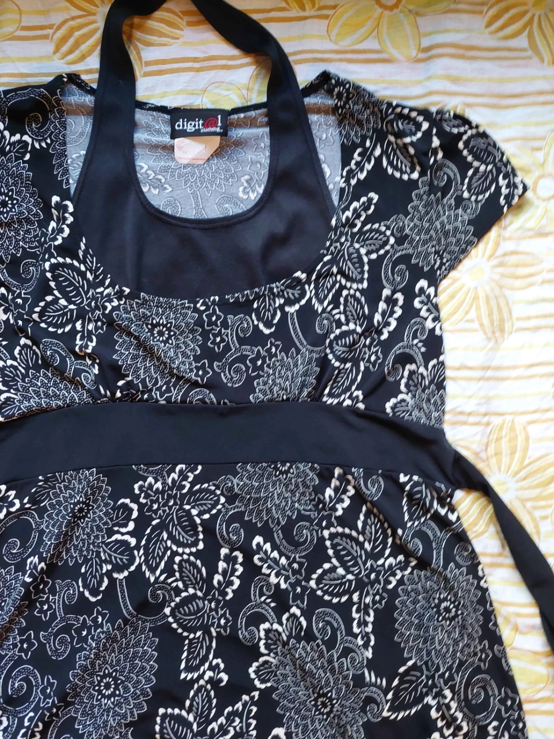 adorable y2k Digit@l Clothing black floral babydoll top with an adjustable tie waist and faux halter top piece.