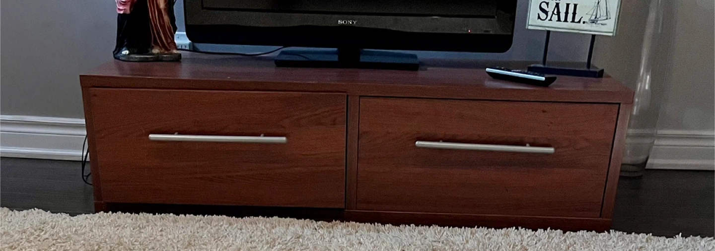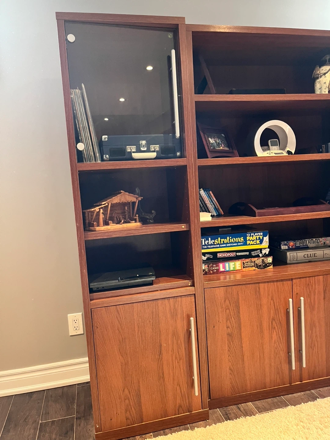 This entertainment unit is made of wood with a glass-fronted cabinet section and multiple shelves. It features lower cabinets for storage and a wide top surface. Great for organizing media and decor!
