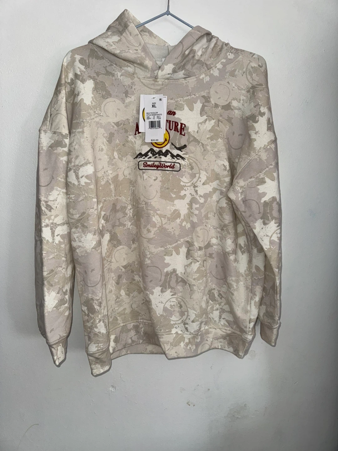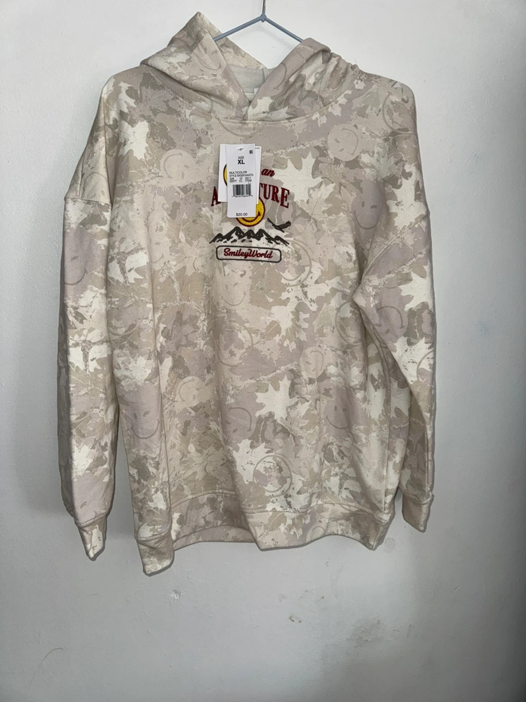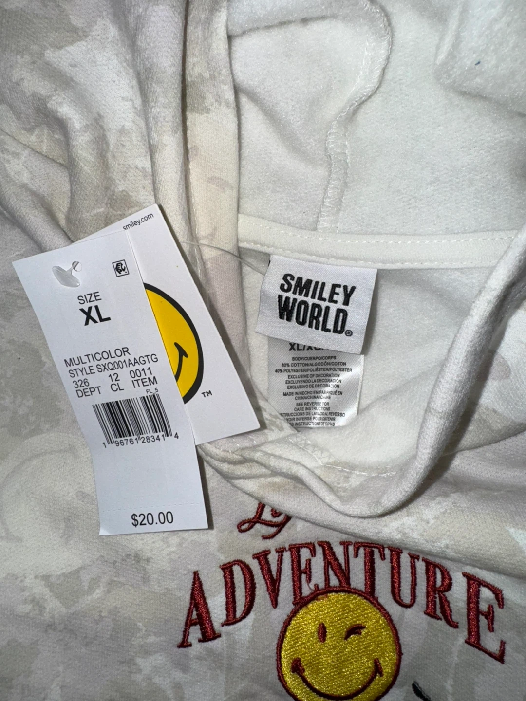 This SmileyWorld hoodie is size XL and features a multicolor pattern with happy face graphics. It's made from a blend of cotton and polyester. Machine washable for easy care.