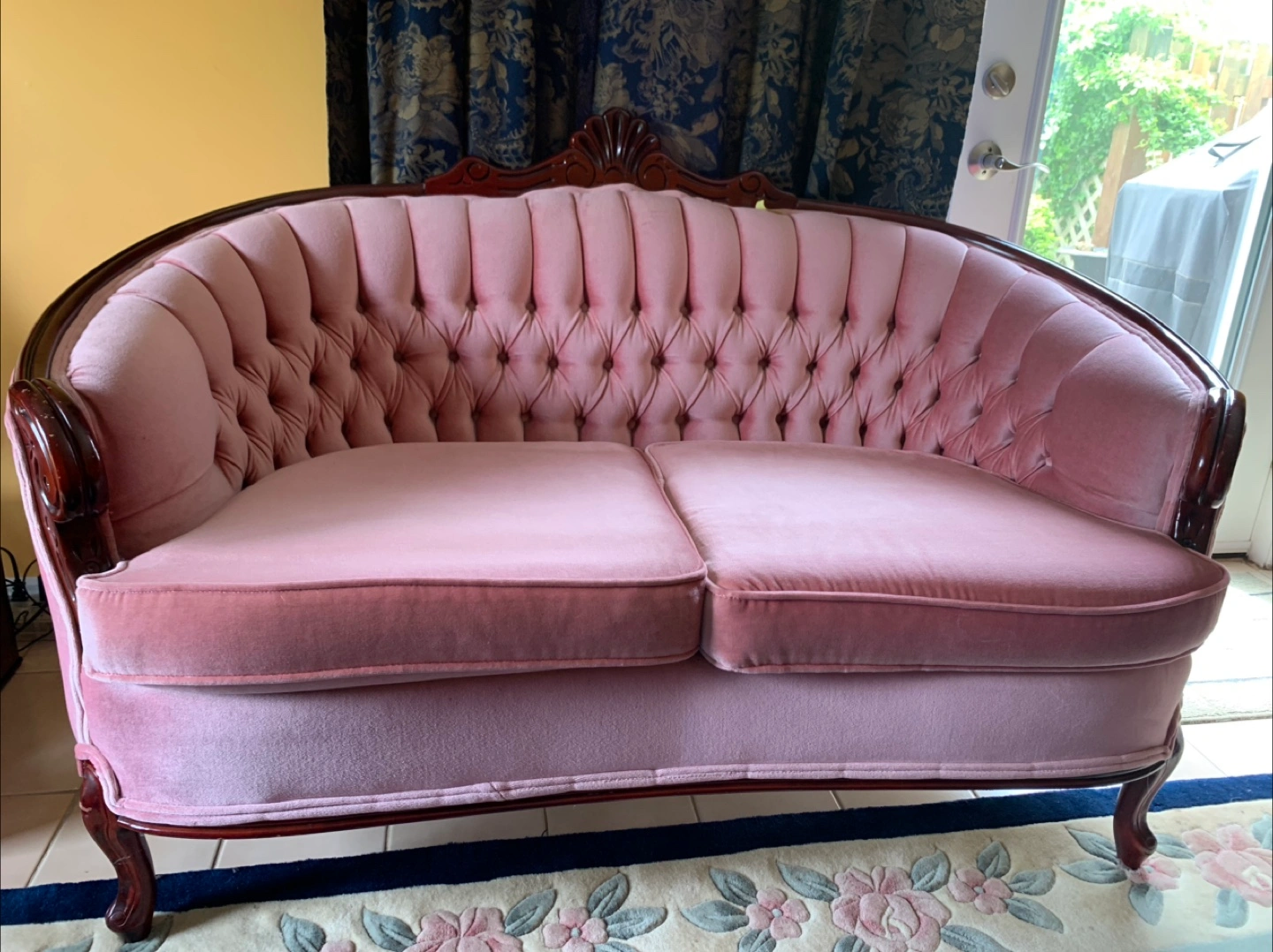 A beautiful vintage sofa and chair set featuring pink velvet material. The set includes one loveseat, one chair, and one large sofa. Perfect for a formal living room or cosy set for tv room. The seats are firm with no lag at all.