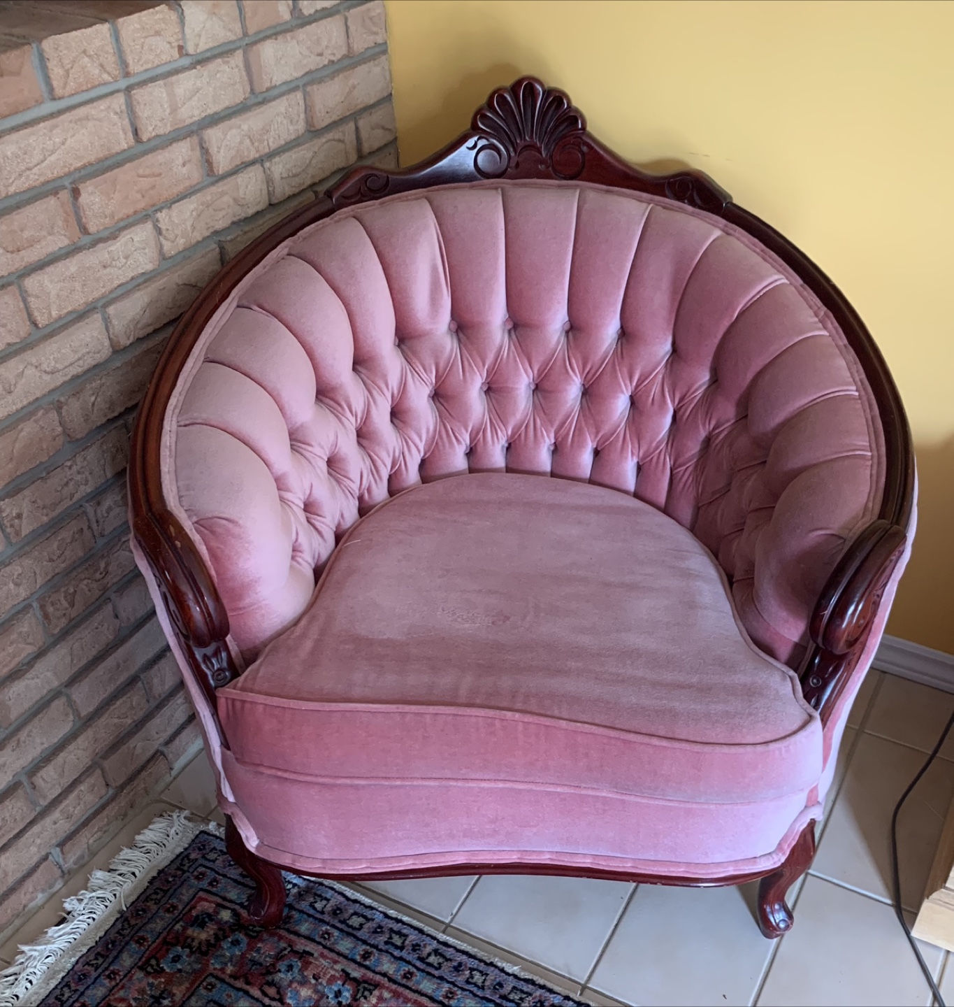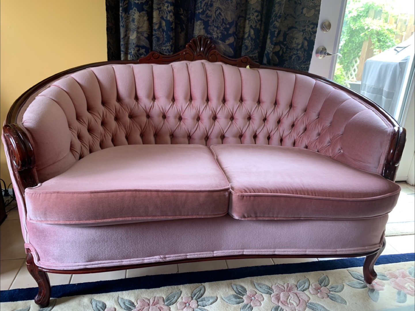A beautiful vintage sofa and chair set featuring pink velvet material. The set includes one loveseat, one chair, and one large sofa. Perfect for a formal living room or cosy set for tv room. The seats are firm with no lag at all.