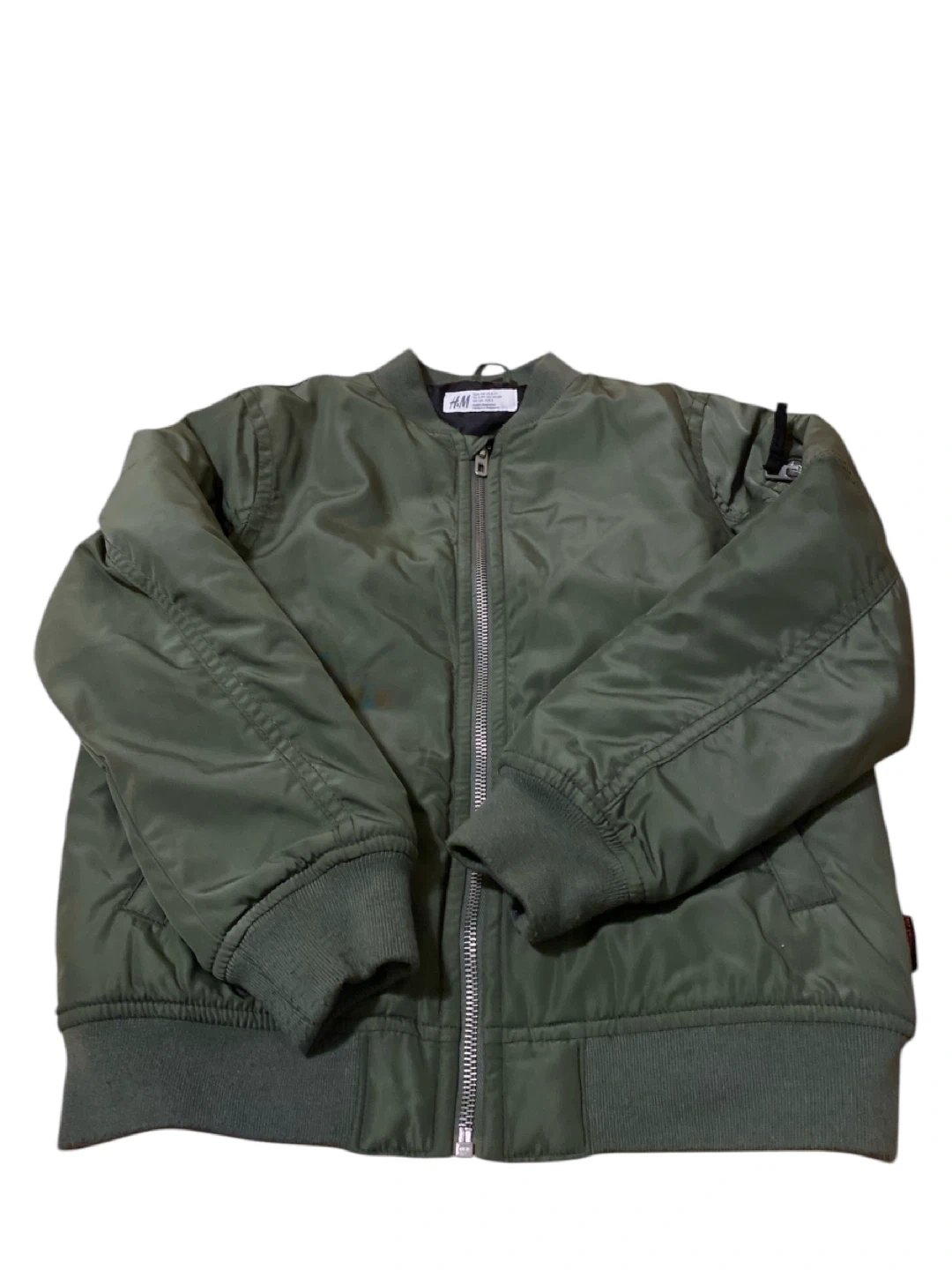 Bundle of four kids' winter jackets. Includes a navy puffer jacket, a camouflage print puffer jacket, and a green bomber-style jacket. The camouflage jacket is size M/M (7-8).