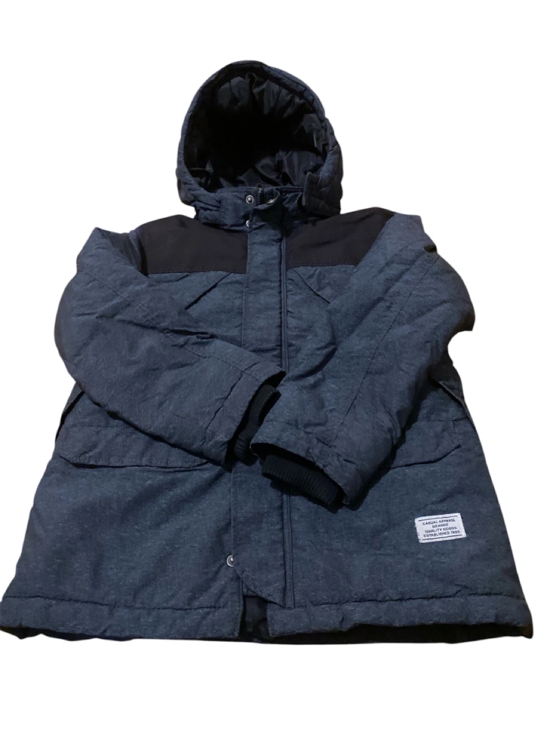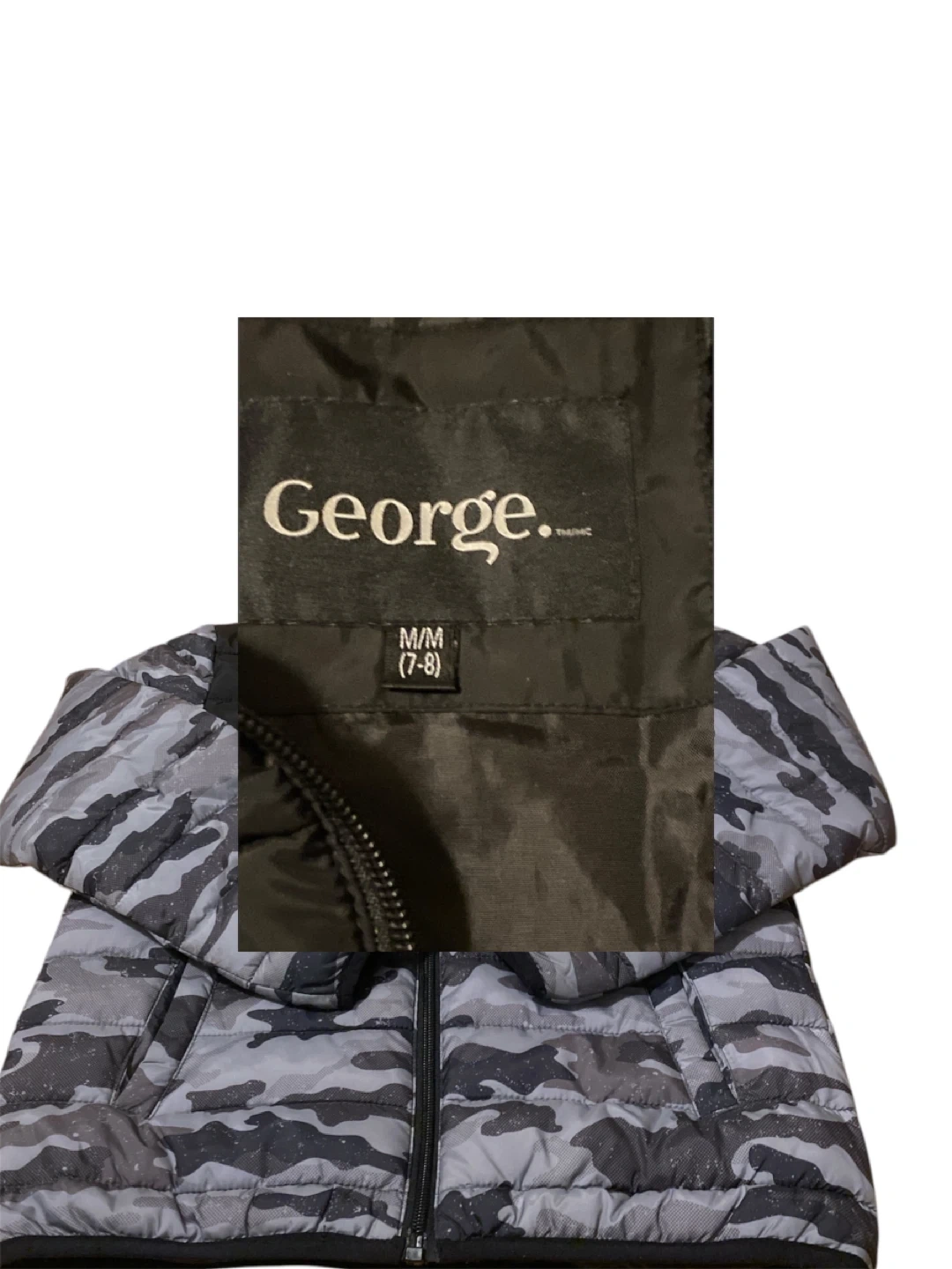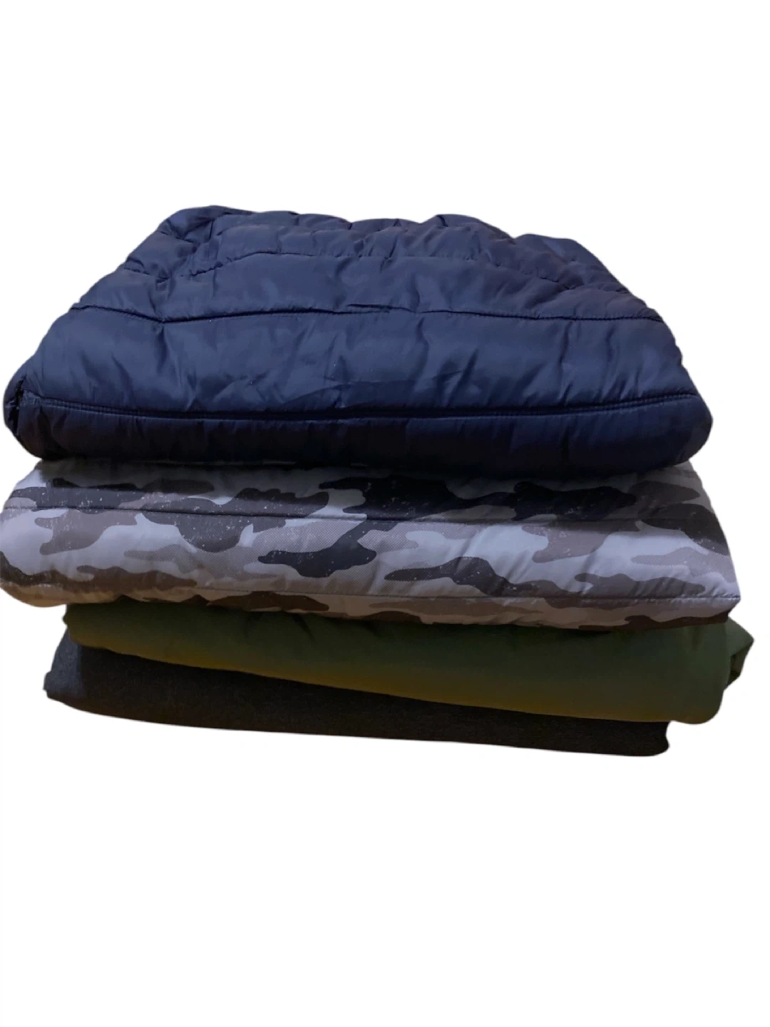 Bundle of four kids' winter jackets. Includes a navy puffer jacket, a camouflage print puffer jacket, and a green bomber-style jacket. The camouflage jacket is size M/M (7-8).