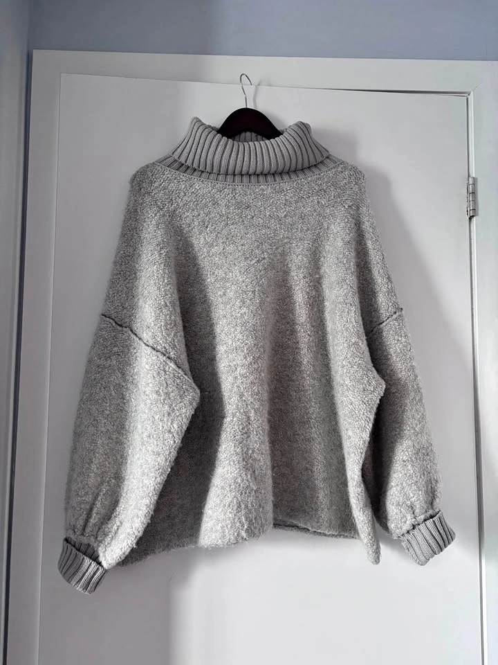 Super cozy sweater, sized "Small" but runs oversized (closer to Large). Love the material and the size of the turtleneck, which can be rolled up or down for style. A rare discontinued find!
