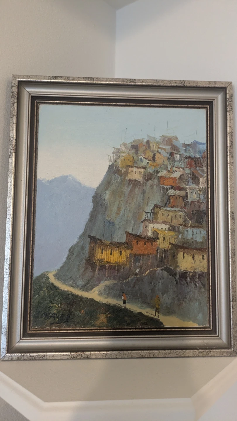 This is a framed oil painting depicting a village built on a mountainside. The artwork shows a winding path with two figures walking along it. It's a lovely original piece