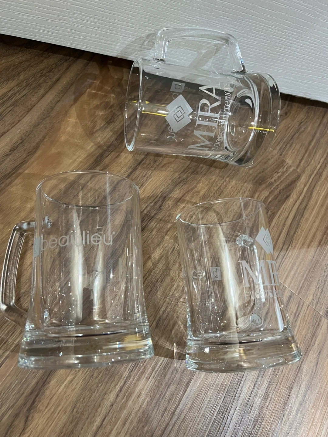Three clear glass beer mugs. Possibly abandoned due to incomplete logo printing.