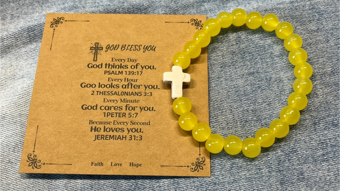 This is a yellow beaded bracelet with a white cross charm. The card accompanying it has Bible verses about God's love and care for you. It's a lovely reminder of faith.