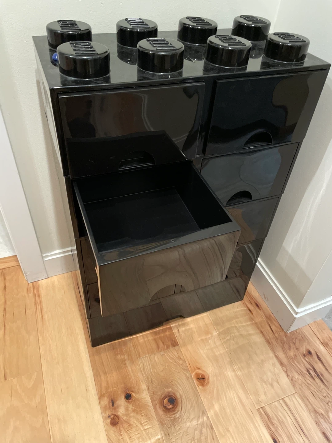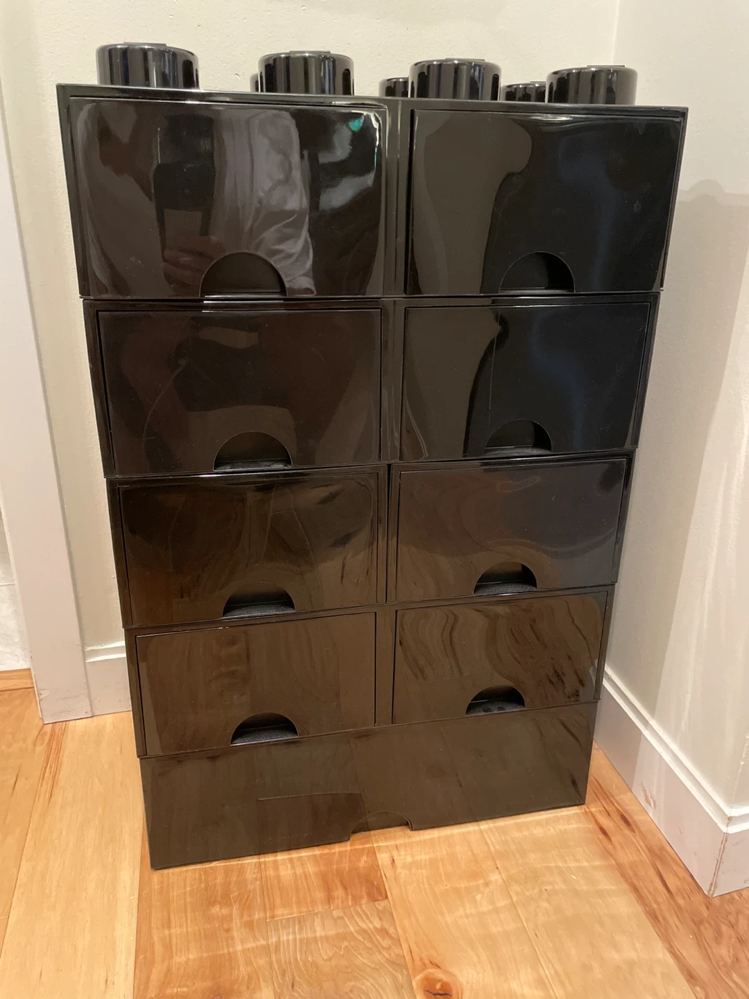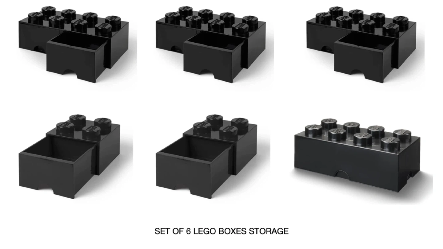Selling a set of 6 LEGO storage boxes in black! These are perfect for organizing small items and adding a playful touch to any room. Each box features a drawer for easy access and a classic LEGO brick design on top