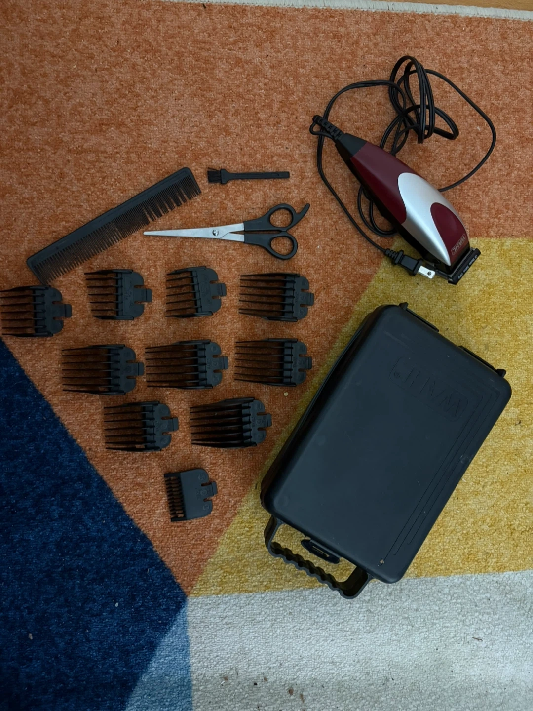 Selling a Wahl hair clipper set. It comes with various clipper guards, a comb, scissors, and a cleaning brush. The clippers are in good working condition and include a handy carrying case to keep everything organized