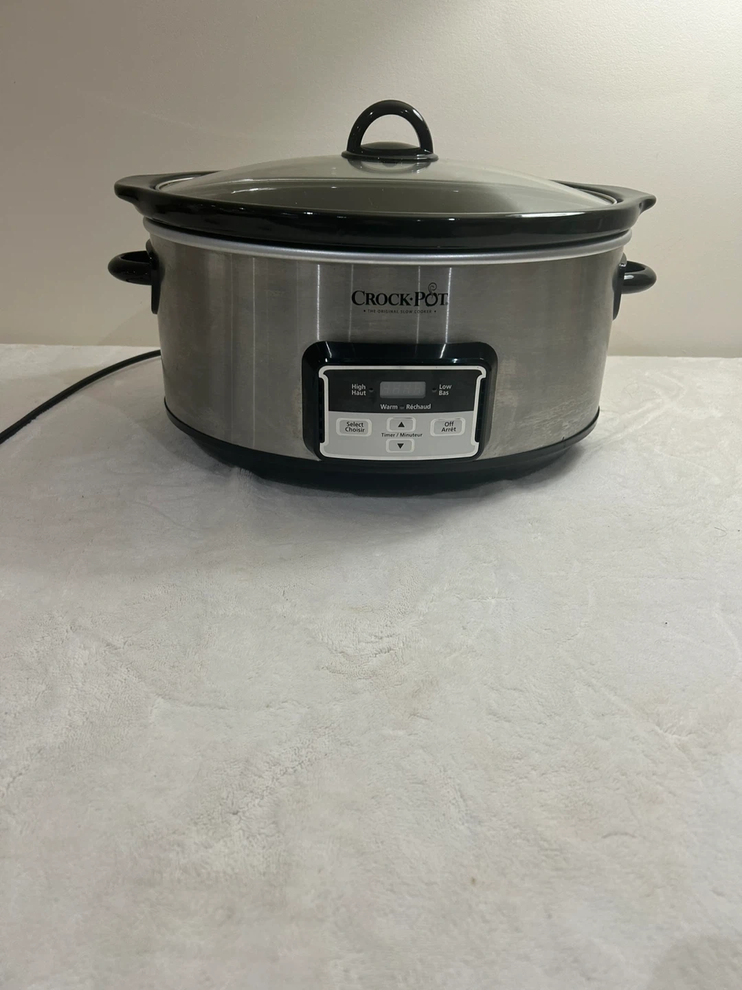 This Crock-Pot slow cooker is silver with a black insert and a glass lid. It has settings for High, Low, and Warm. It's great for making large meals.