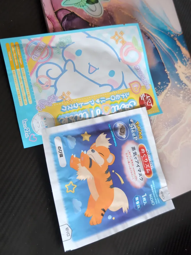 Two face masks! One is a Pokemon MegRhythm Gentle Steam Eye Mask and the other is a Cinnamoroll Art Mask (with instructions in English).