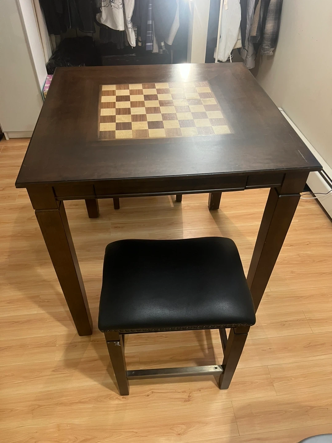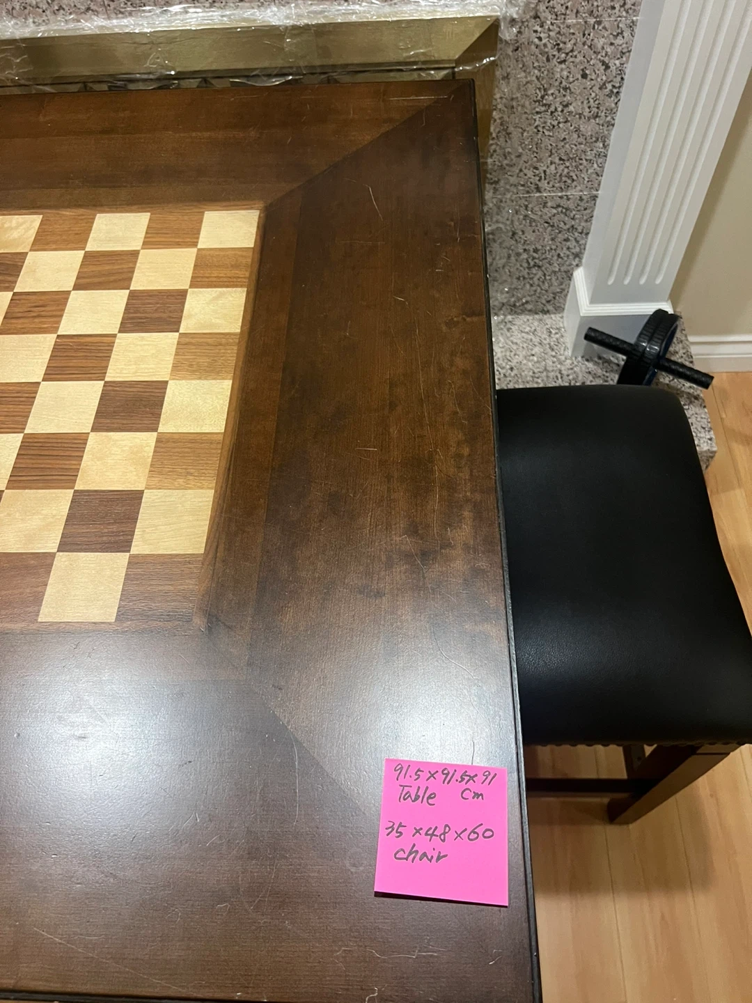 This wooden table features a built-in chessboard on top. It has a drawer for storing game pieces and comes with two chairs. Table dimensions: 91.5 x 91.5 x 91 cm.Chair dimensions: 35x48 x 60cm. 1 table & 2 stools. Used several times since. Scratches on it.
