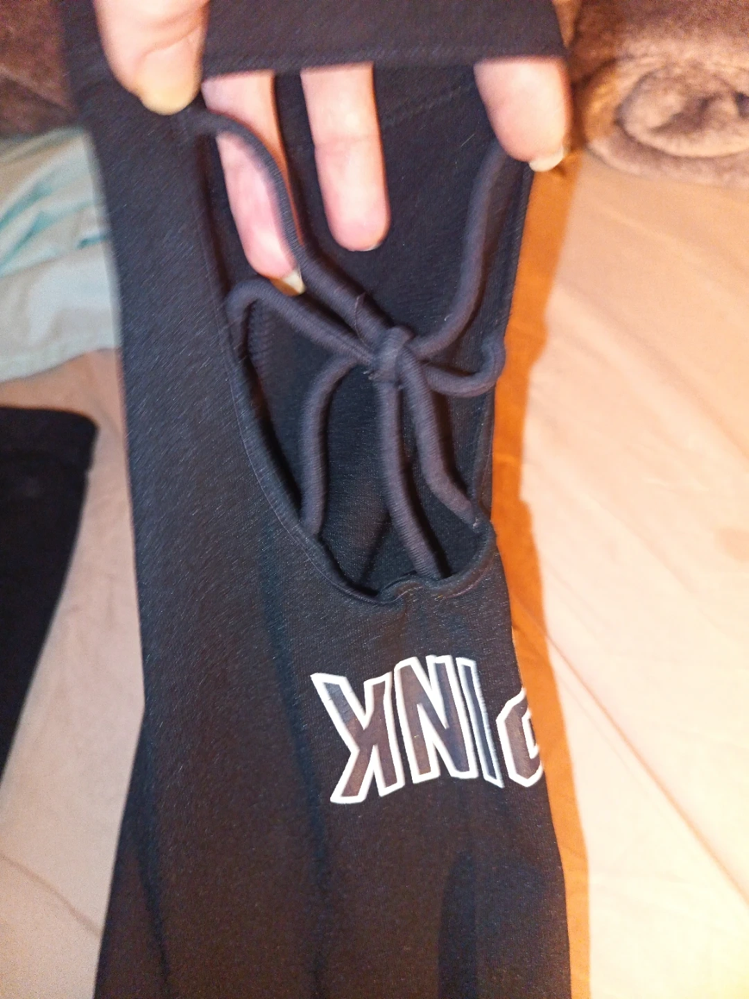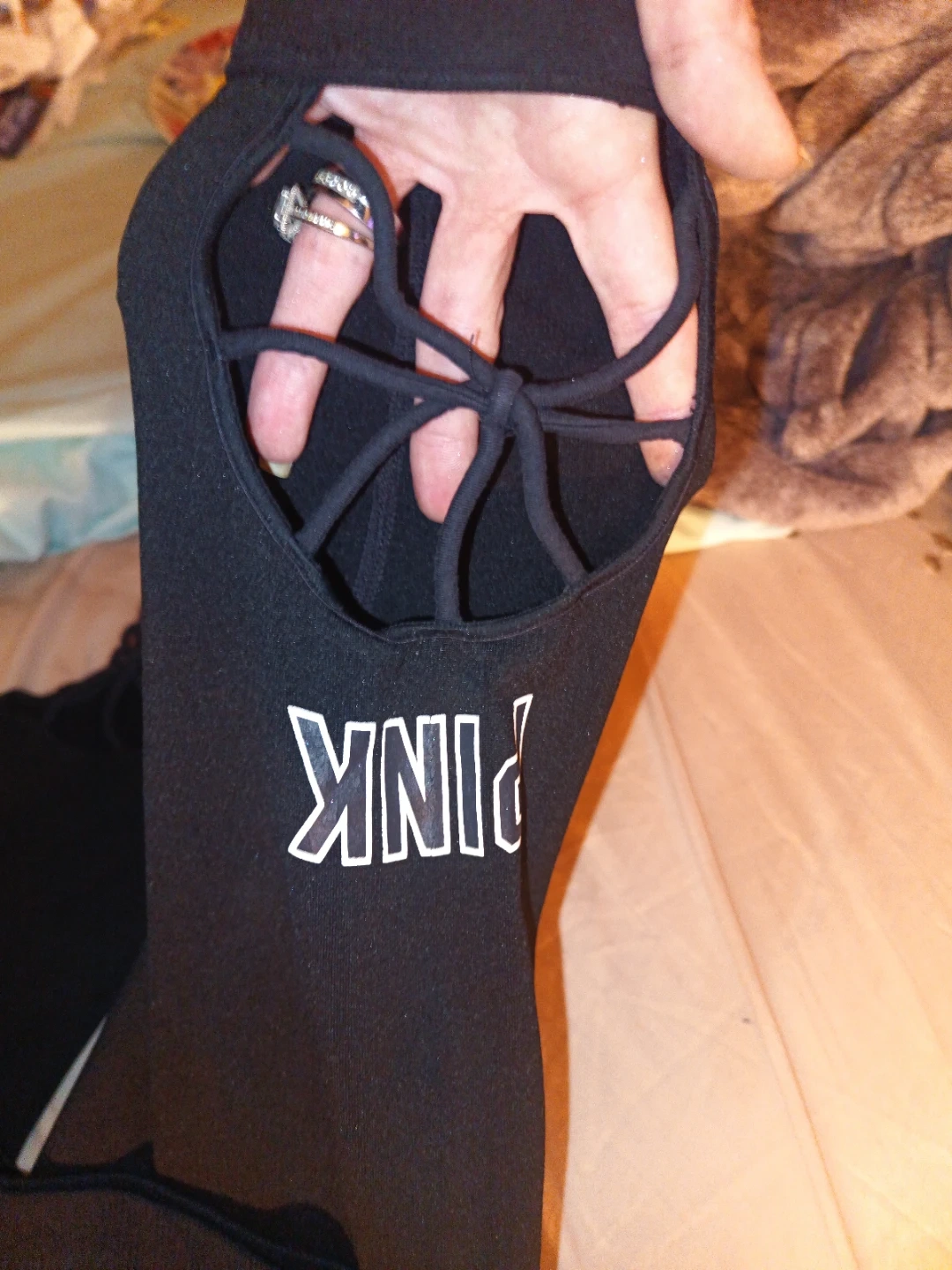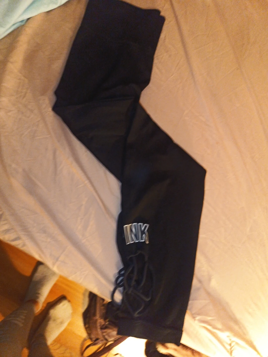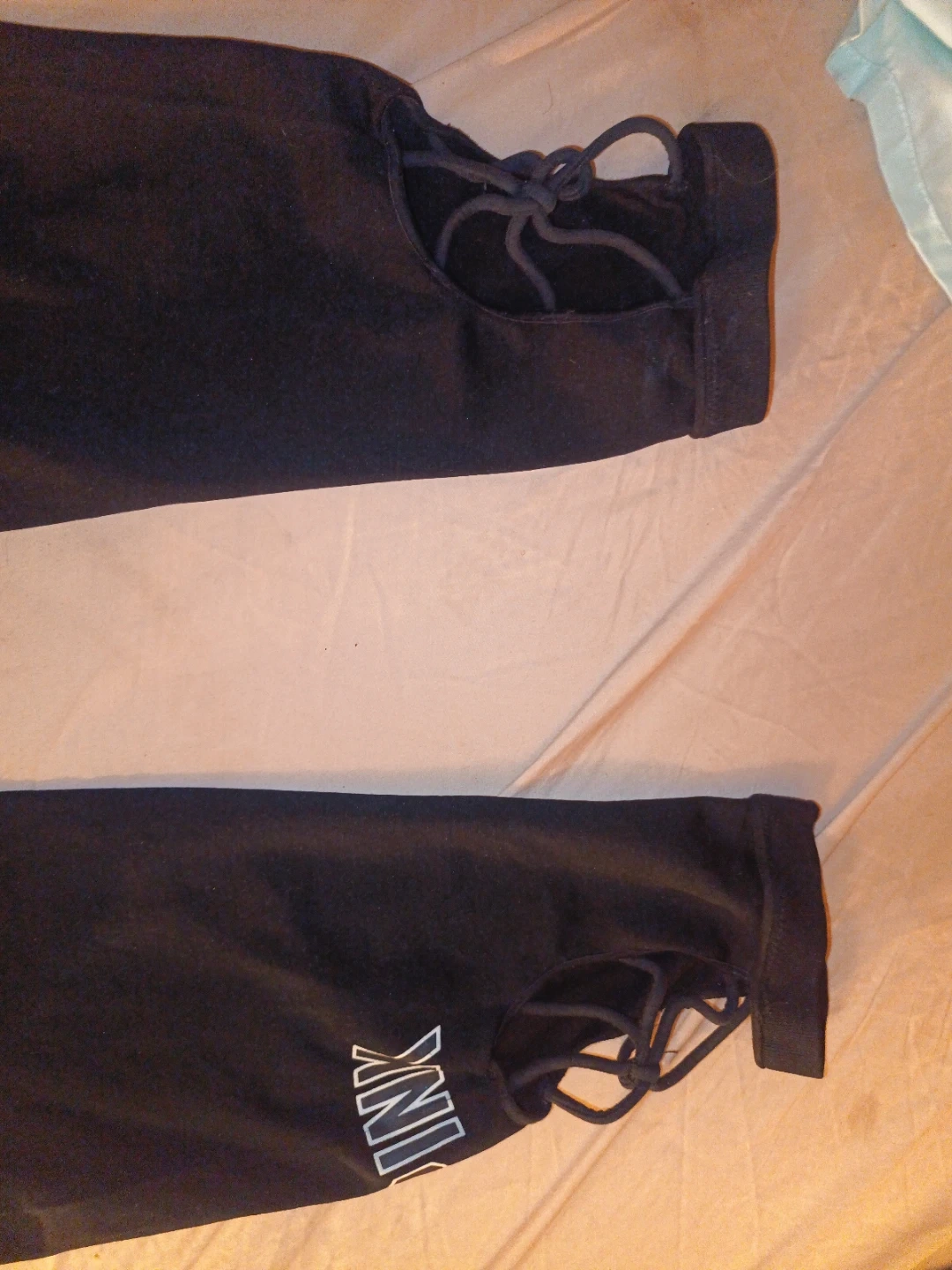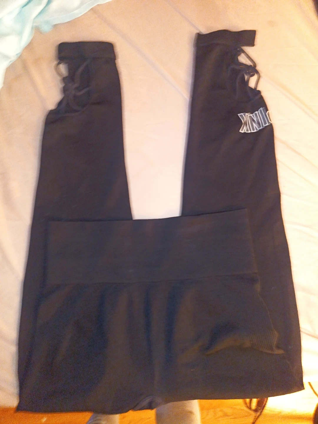 Selling a pair of PINK Ultimate leggings in black. They're in great condition and are a size small. The leggings have a unique detail at the ankle with a lace-up design. Perfect for workouts or just lounging around!
