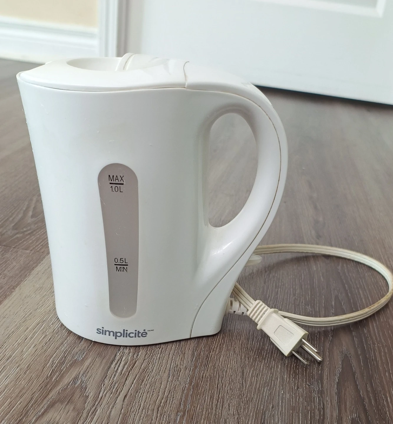 Simplicité white electric kettle. Max 1.0L capacity, min 0.5L. It's great for quickly boiling water for tea or coffee!